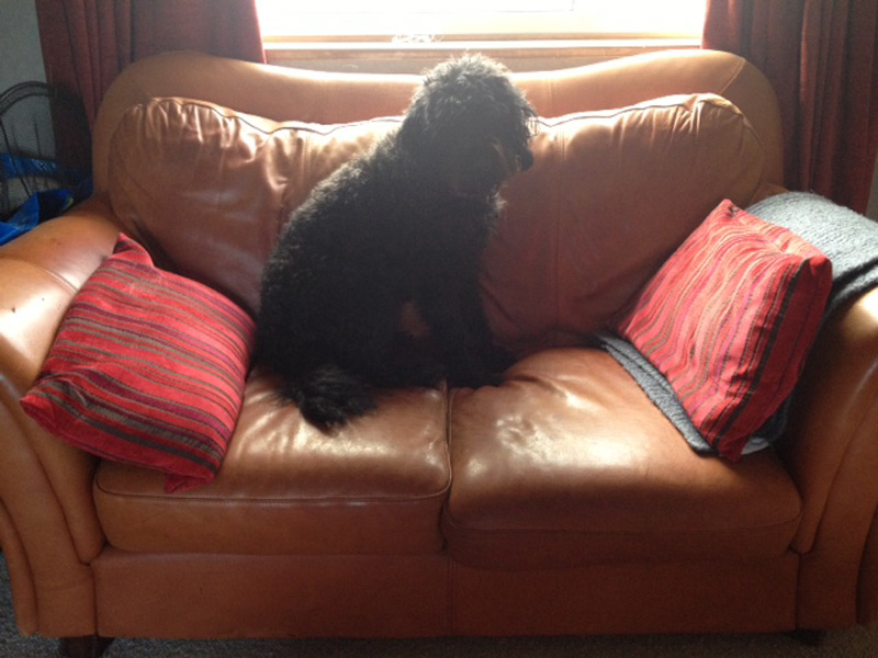 My two ethical leather sofas, the leather is taken from Kudoo’s that die naturally in nature reserve….it’s not treated so all the scars are still present……and of course my pooch, Labradoodle Ruby….she’s really not allowed on them but Dad had gone to work!