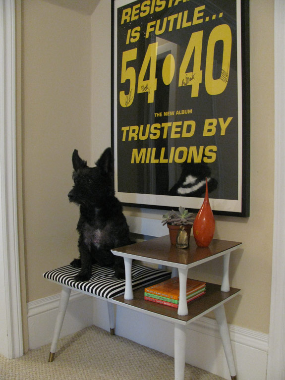 Here is Greyson on a telephone bench, rockin’ out with a 1990s signed 54-40 poster.