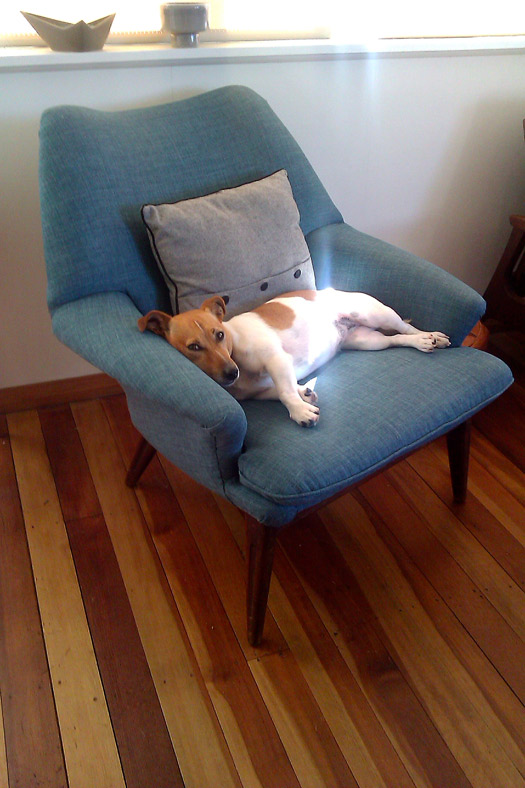 Here is a photo of my Jack Russell, Poppy, lounging on my recently recovered Parker Knoll armchair.