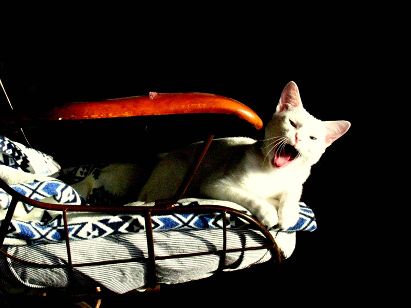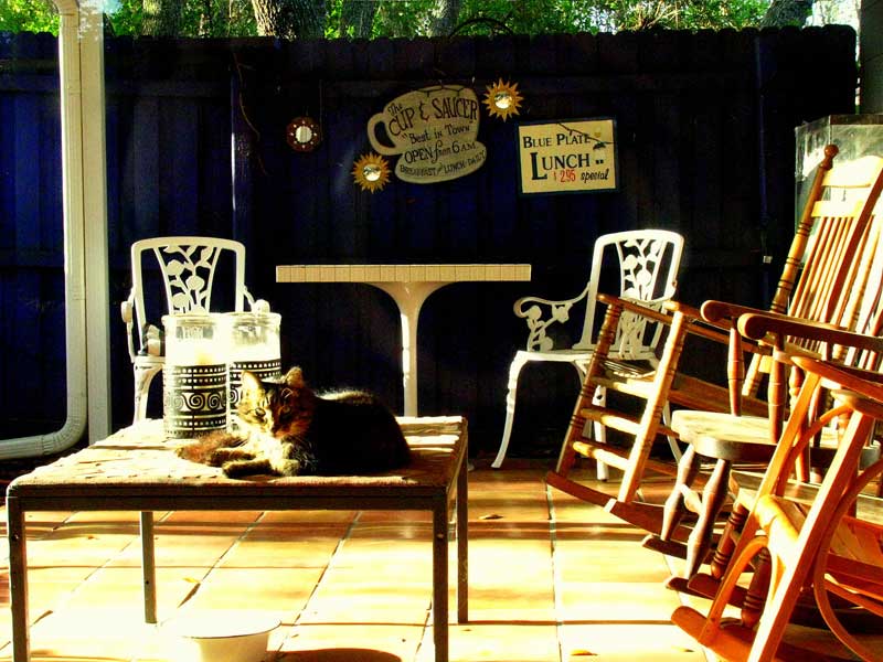 Here are a two shots of Christmas (the white kitty) on a wire chair and then two of Sydney (our outdoor grey love ball). He is sitting on the patio coffee table.