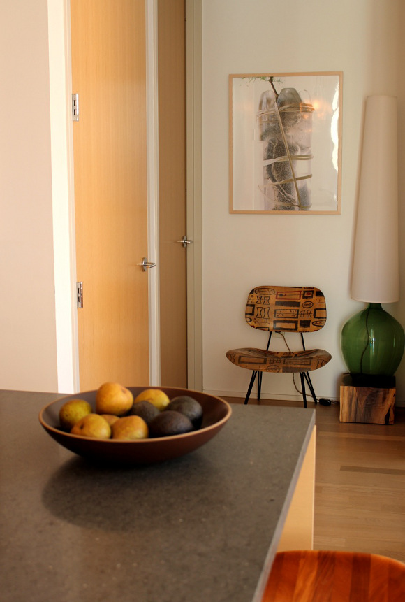 Love the pops of colour and timber worked with the greys and neutrals – So contemporary and classy, yet fun and relaxed at the same time?? Modernist touches in the furniture too – LOVE the single chair with graphic patterns and quirkly glass lampbase with exaggerated shade together!