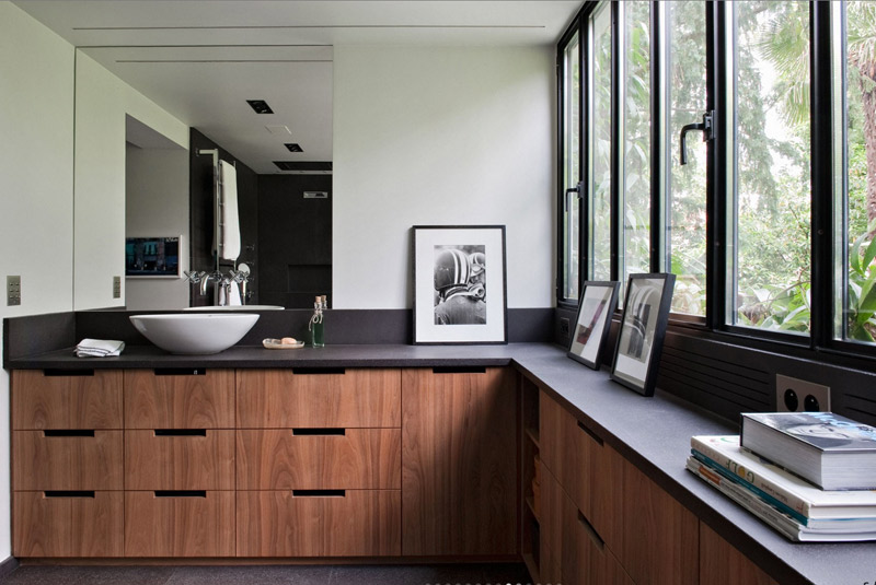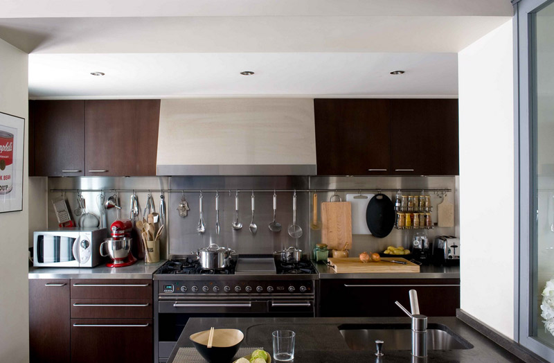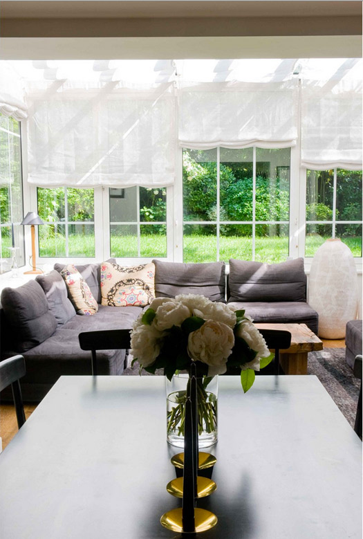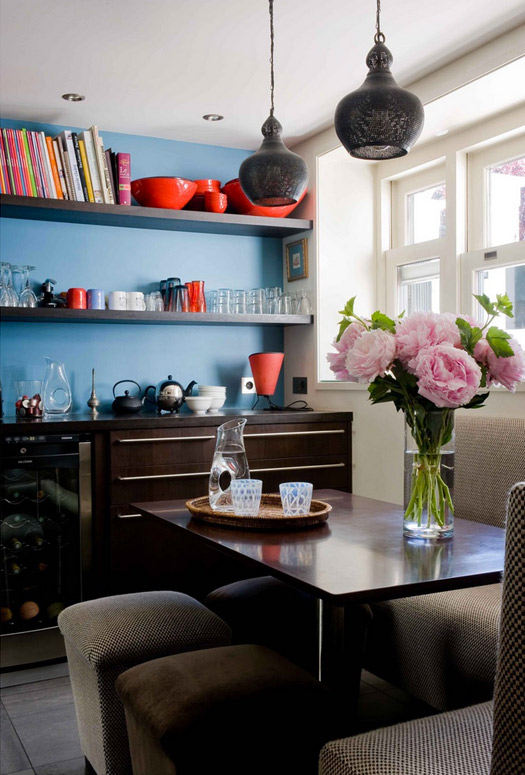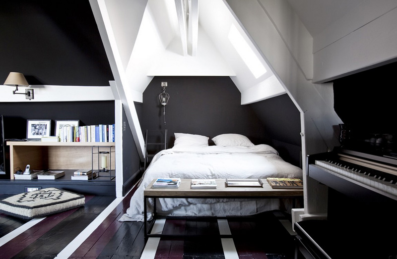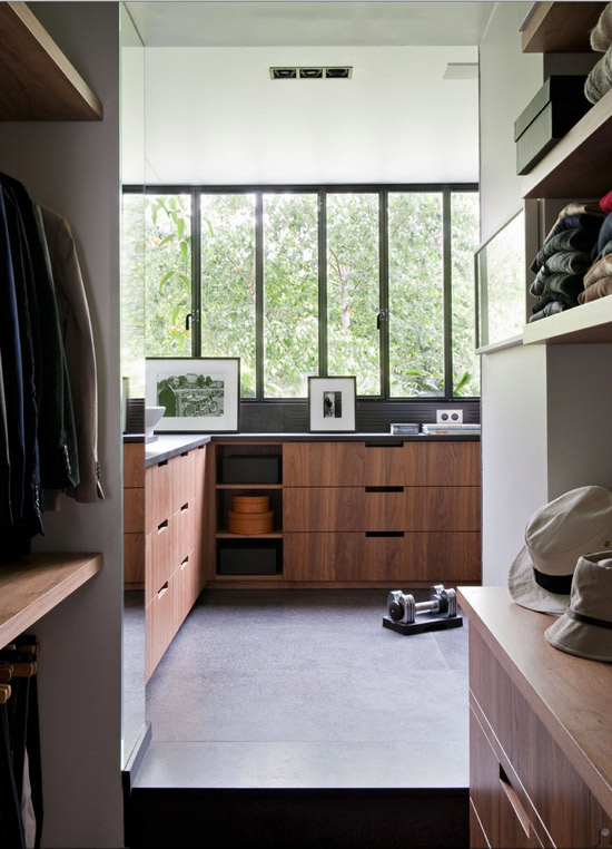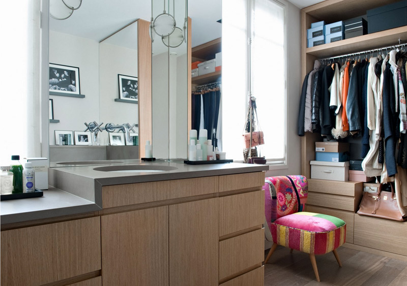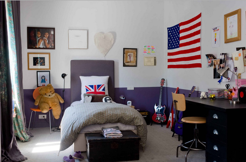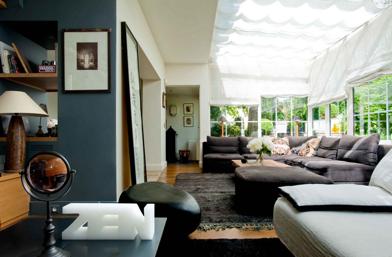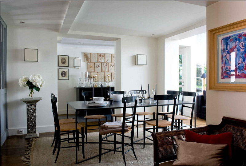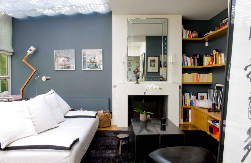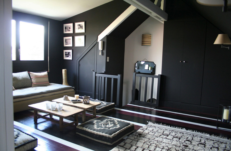 It’s been a while since I blogged some projects by Parisian interior designer Sarah Lavoine (see here and here). She is one of my favourite designers – amazing creativity, unpretentious style, and not afraid to go bold. Here is another project of hers with lots of bits and bobs to love. The smooshy sectional, the perfect blue-grey wall, the handy rod on the kitchen backsplash, to-die-for dressing rooms, black cozy attic, a painted floor in dramatic stripes…