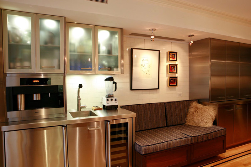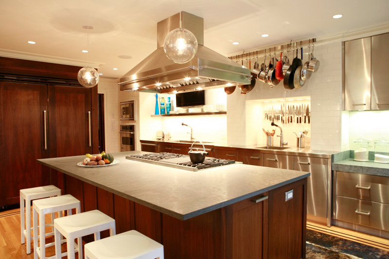 The amount of space is a dream. I am a lover of subway tiles (but with darker grout, and maybe not on every wall space). Great idea to line up all the ovens/microwave etc. down on one end so when you’re taking food in and out you don’t get in anyone’s way. Cooktops in the island is great for the cook so they can stir and chat. The rod for pots and pans is handy (as are TWO SINKS) if you keep them clean. Another dream – having enough room for a coffee/bar area, built-in sofa and shelving for dry goods/spices. I don’t think I would ever do a stainless counter – the scratches would send me over the edge (although seamless counter/sinks would be awesome when cleaning up).  3 types of counter material and all those stainless cabinets is too much in my opinion. I’m curious to know what you all think…..
