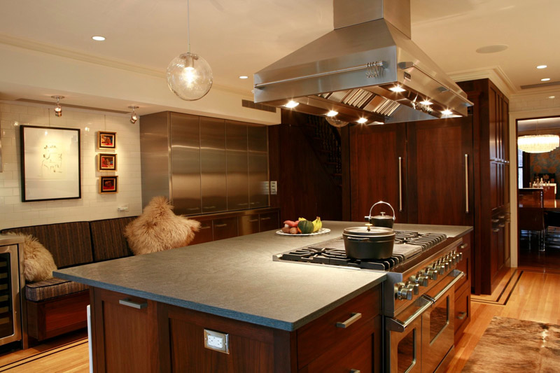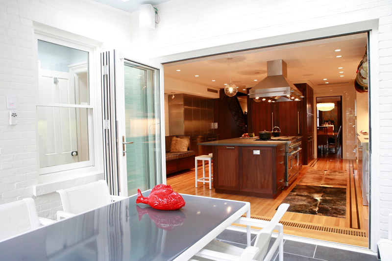 I came across this kitchen by Barry Rice and found it intriguing….in a mostly love/little bit ‘o hate way. Here are some details: The kitchen of this single-family brownstone in Brooklyn’s historic Clinton Hill neighborhood underwent a dramatic transformation. Small windows were replaced with accordion-folding glass doors that open to a screened dining area, and a warren of pantries was removed to create a large, open cooking and entertaining space. The working side of the kitchen features distinct zones for prep, cooking, baking and clean-up, and the guest side includes a bar, counter seating and a built-in sofa. Stainless counters and subway tile are practical and easy to clean, while walnut cabinetry and a stone island and baking top add warmth to the space.