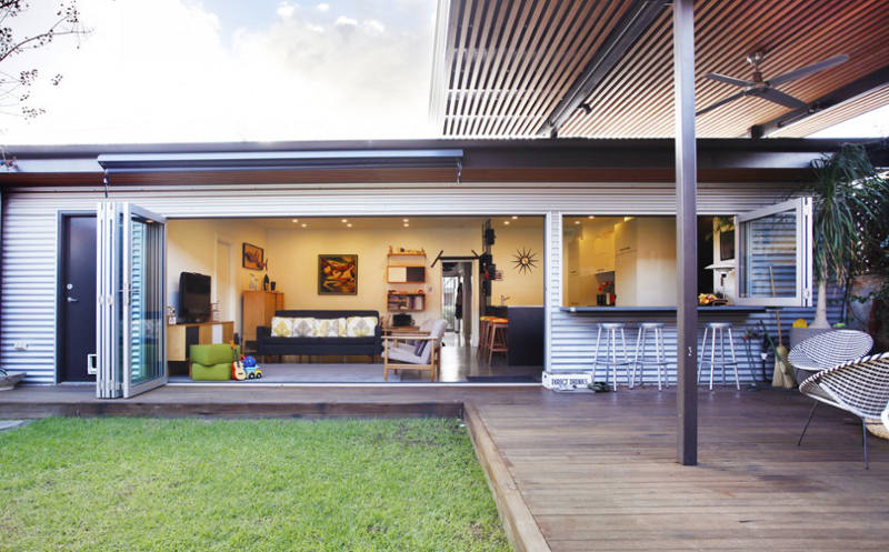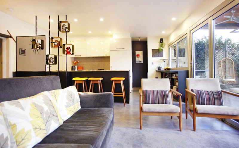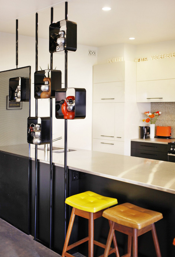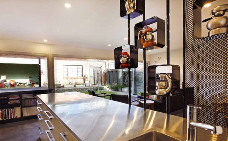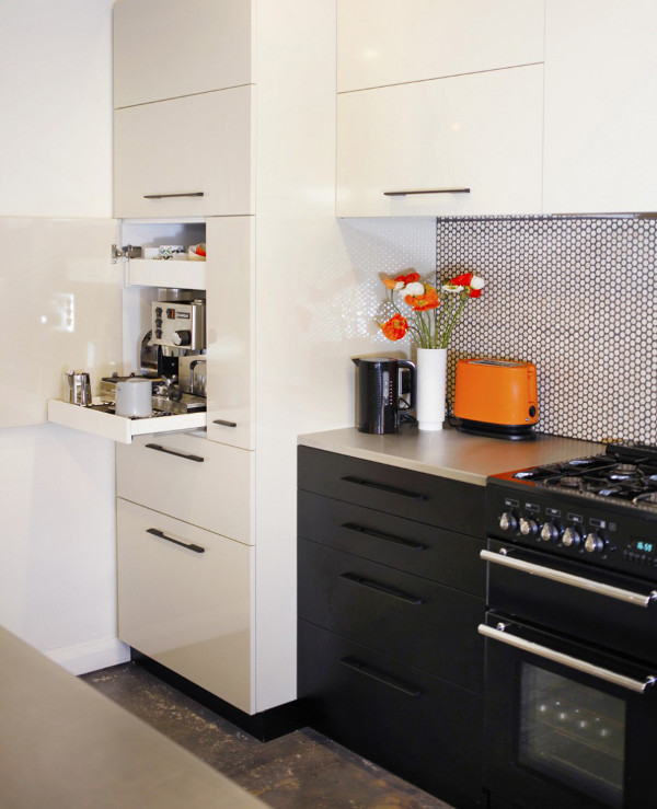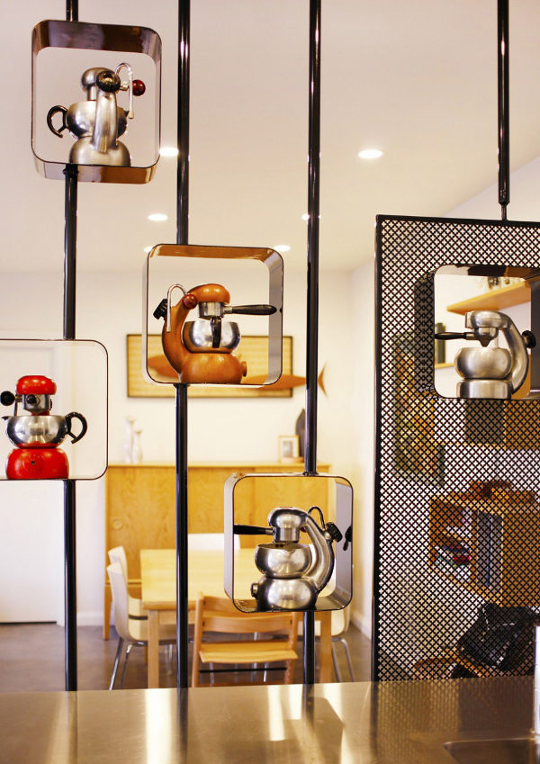 A quirky kitchen and living area for midcentury coffee aficionados. Or should that be addicts? What do I love more? The little coffee making area? The midcentury furniture? The mesh wall divider? The retro finishes? No, if I was honest, I must admit that I have a serious case of espresso machine envy. How can someone own that many Atomic coffee machines? A fab design by South Australian interior design firm Koush.