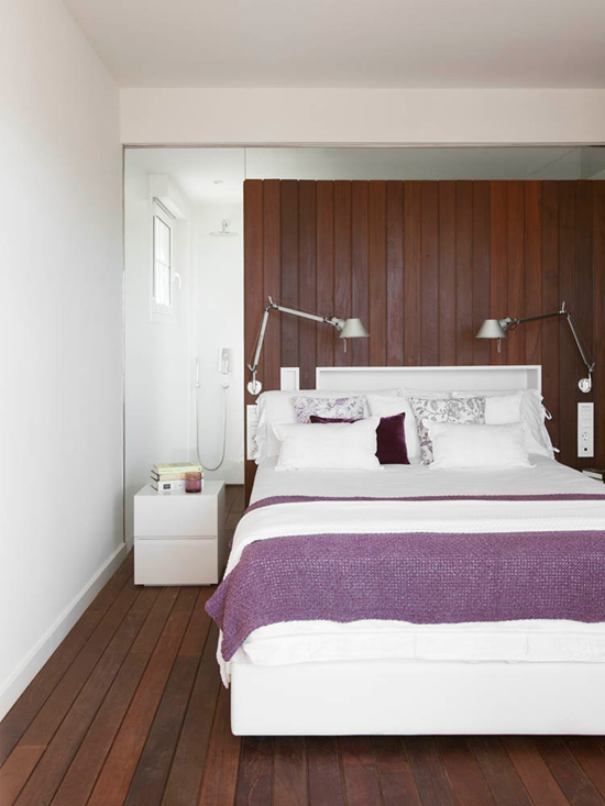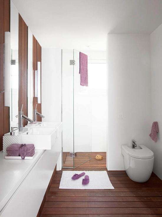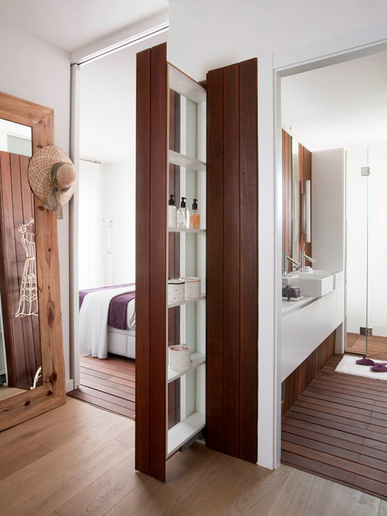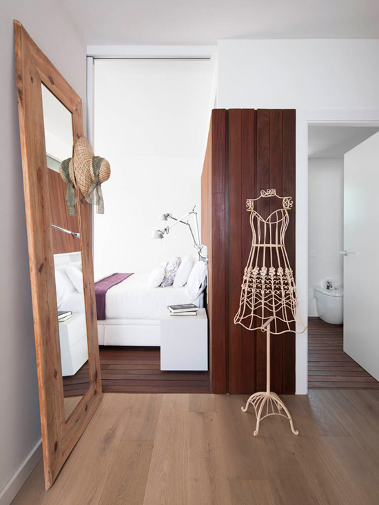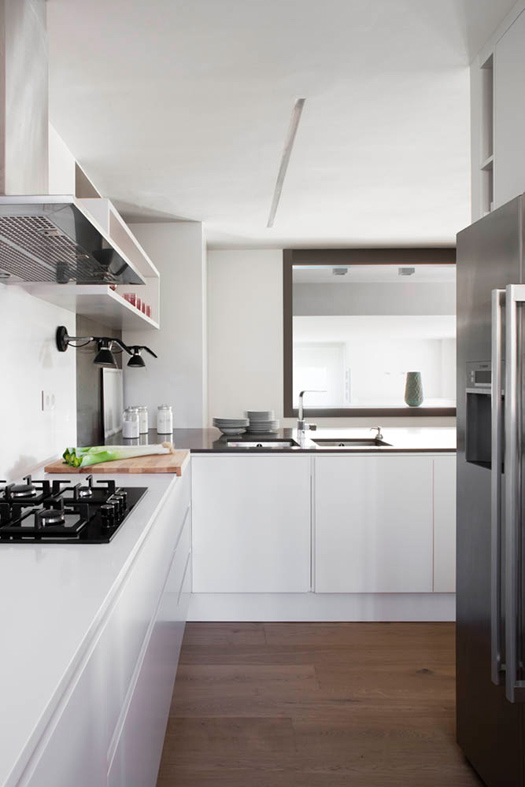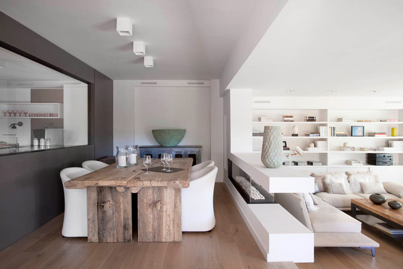 I have another stunning home for you designed by the talented Susanna Cots. The sea is the centre that marks the disposition of the rooms, the lighting and the colours of this interiors project. Inspired by the house’s exterior, we captured the lights and the shades which contribute to simplicity and calm. White predominates and gives to the space a personality that attracts order, and is complemented by colour. The design stretches out to the sea from every part of the house, to allow Nature in. My favourite combination – a simple, modern interior in mostly white with rustic accents (gorgeous coffee and dining tables!). The flooring in the bedroom and bathroom looks a bit like decking but I can overlook that. I am intrigued by the kitchen – very cool how the countertops are white and black and how the black carries up the wall.