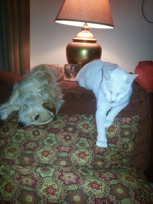 1 – Tucker (dog) Oliver (cat) on the back of an Ikea chaise with Pier1 pillow. No Tucker is not dead, he’s just faking because he doesn’t like having his photo taken. Lamp behind is ceramic painted to look like brass (antique-ish)