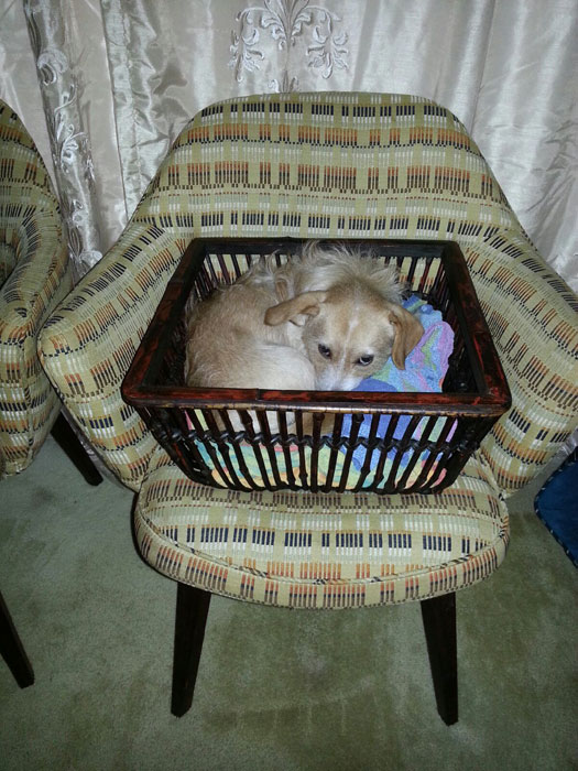 This time in one of my four vintage Saarinen chairs I got for $23 per chair at a local Salvation Army. He loves to sleep in his basket, I just move it wherever it suits me and he jumps right in.
