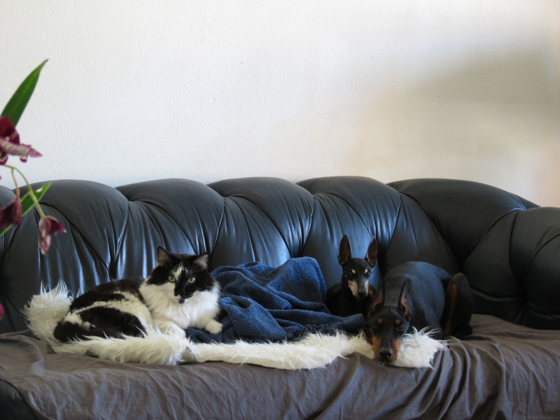 First photo is on the new leather couch which they hate unless it’s covered! 6 yo Pooh Kitty and his Manchester Terrier housemates: 13yo Pizzaz and 6 yo Jimmy Choo.