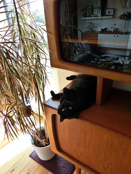 I send you a picture of our cat Luna laying on our cupboard. The nice thing is in the reflecting glas you can see more of the rest of the room.