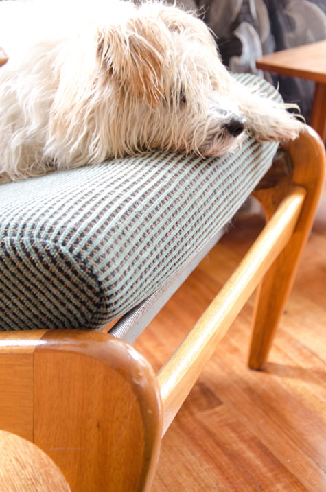 This picture is from one of my finished interior photo shoots where we were trying to take a detail shot of this reupholstered mid century chair. “Louis” the terrier wouldn’t budge! I love how his scruffy coat is juxtaposed to the gloss of the timber.
