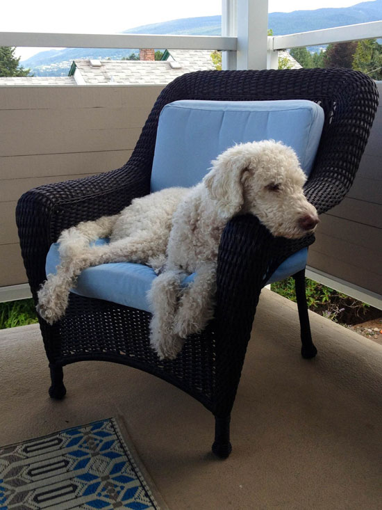 Our labradoodle Broulee hanging out on our patio furniture.