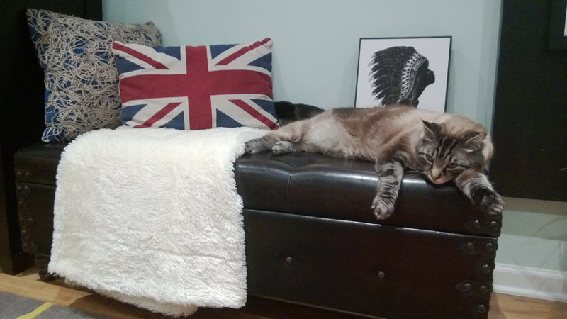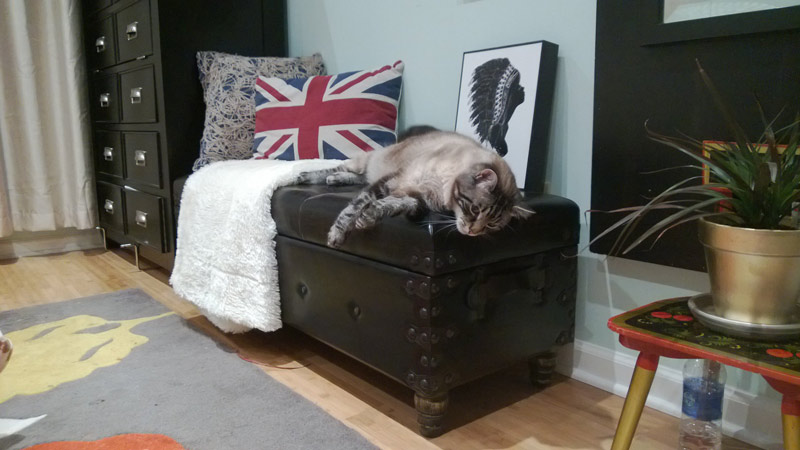 As soon as I brought home this leather tufted storage ottoman, Kitty couldn’t help himself.