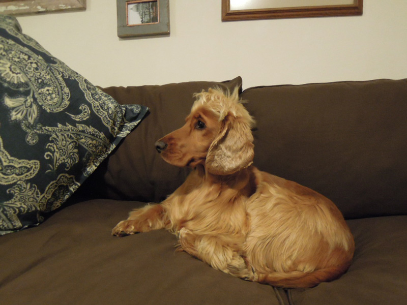 Benji shows off his new haircut on our sofa. When friends visit he refuses to get off!