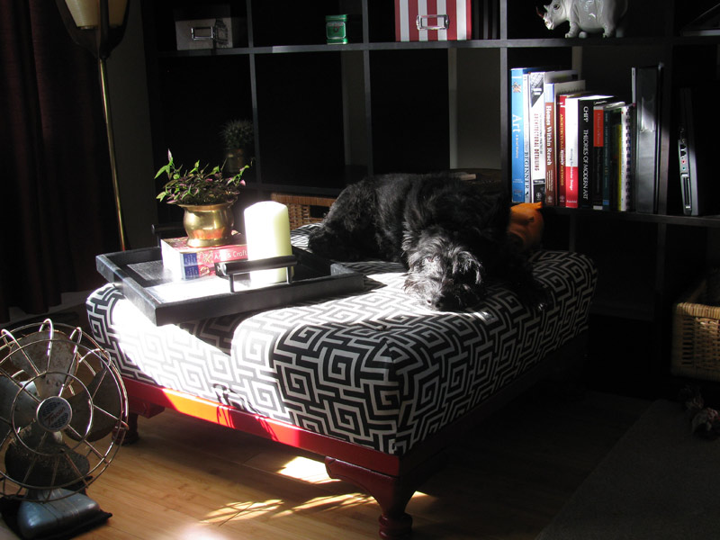 I just caught Grey-dog having a nap on an ottoman. He soaks up the sun whenever he can, even if only his nose gets it.