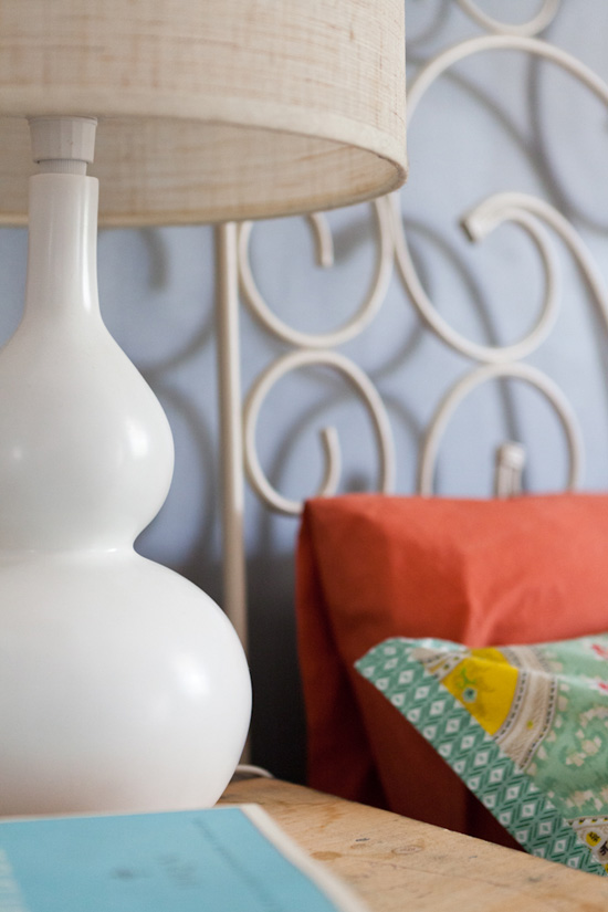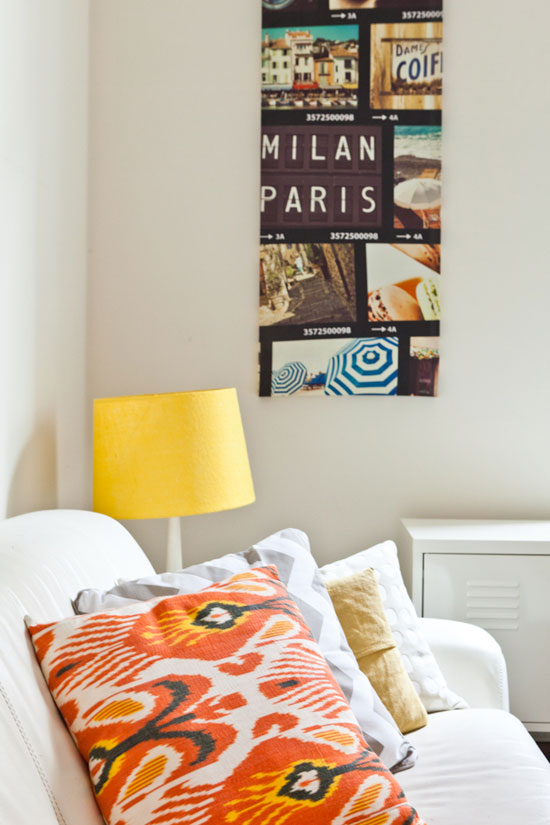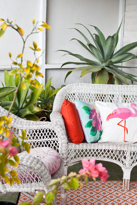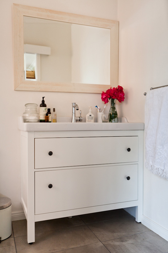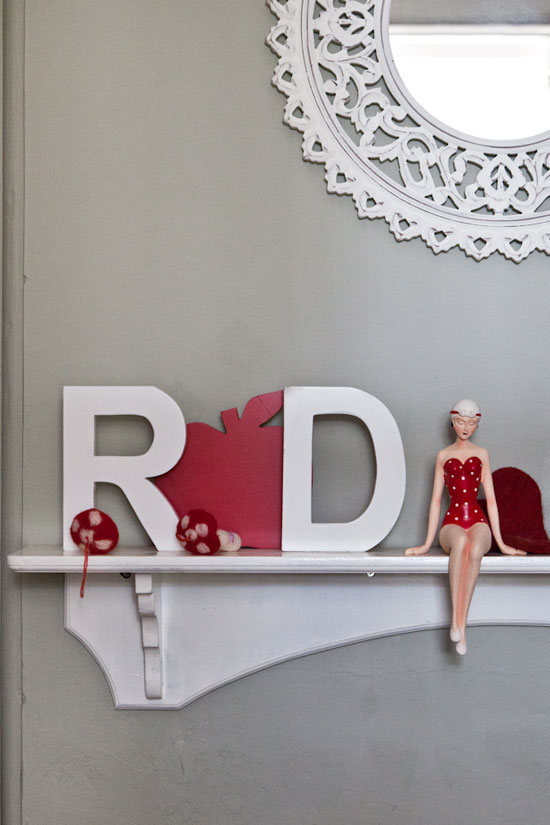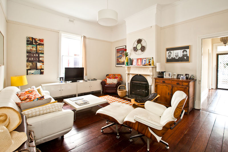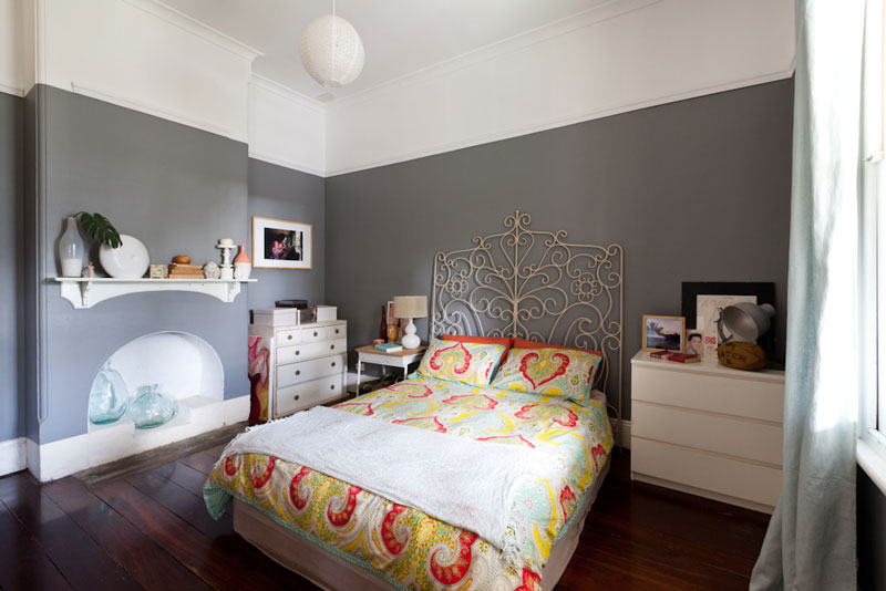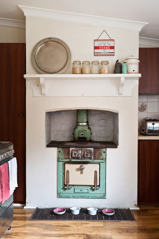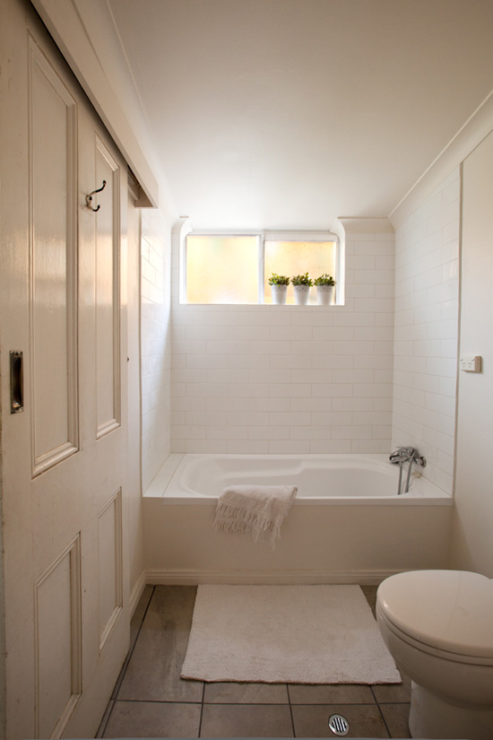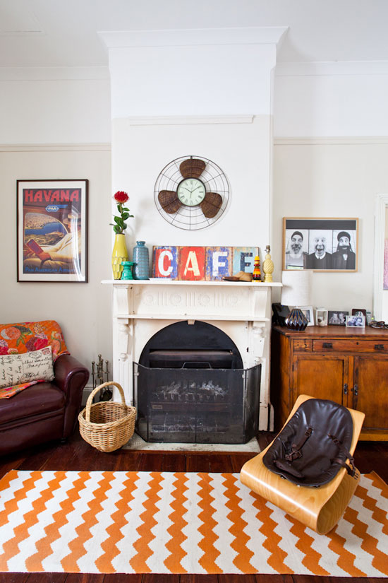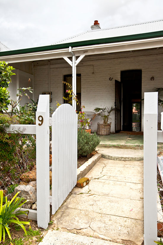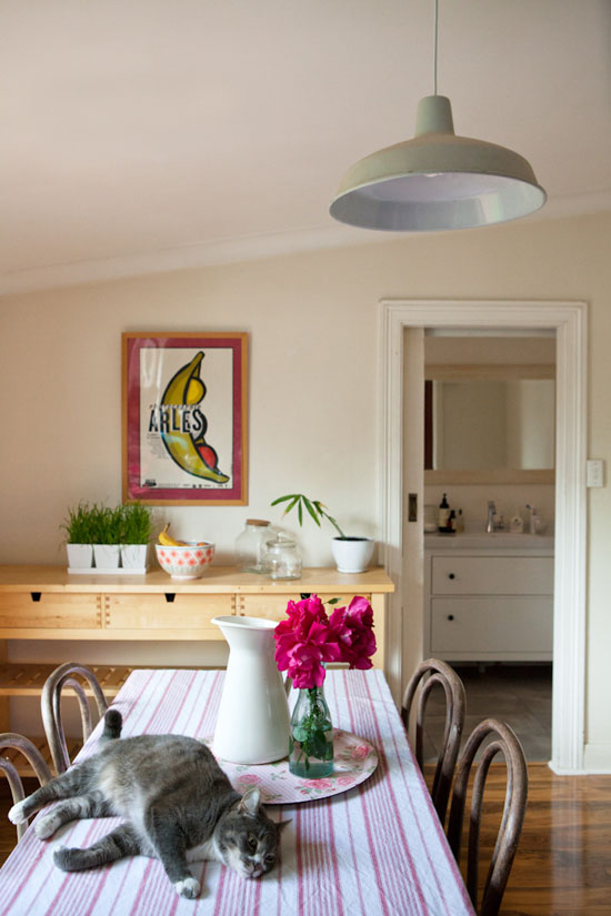 Nelly is an interior stylist in Australia whose work we have blogged a few times (1, 2, 3, 4), and she’s about to embark on a new adventure – home ownership! She sent over some info and photos of the rental home she had been living in and sprucing up – I love her vintage, funky style and what a cute home! It’s an early 20th century workers cottage in the very pretty, partially heritage–listed suburb of Guildford in Western Australia. It has old jarrah floorboards, super high ceilings, a front verandah, established trees (including a heavily bearing black fig tree and about five loquat trees – yum!), an incredibly pretty–looking old meter stove, and enough quirks to melt my heart (I can’t list them all, but think along the lines of skirting boards that no longer reach the floor, house on stilts and wide gaps between each floor board which means any little thingy you drop on the floor may end up under the house, totally unreachable until someone blows the house, etc). When we moved there, it also had yellowing paint on walls and ceilings, a disgustingly sticky 20 year old vinyl in the kitchen and a matching, suspiciously looking carpet in the adjoining dining area, and an unpractical and depressing bathroom. With the landlord’s approval and his financial input towards the cost of material, we painted walls and ceilings and replaced the flooring in the kitchen and dining. Recently, we also entirely renovated the bathroom (new paint, new floor, new layout, new bathtub, etc) so it became much more pleasant and practical, especially for bathing our boisterous 16 month old baby! I prepared a moodboard and cost estimate which I submitted to the landlord, and he recognized the need to do the bathroom up and he approved my plans and financed them. And then, the opportunity to buy our first home arose and we jumped on it. It’s now with a little sadness that we are leaving our beloved rented cottage. Had we stayed any longer, I would have probably tried to convince the landlord to redo the kitchen – those cabinets made of reddish-brown timber-looking laminate and the super narrow benchtop could have really done with an upgrade! But it won’t happen. Instead, I’m now focusing on how to transform, on a tight budget, a generic, character-less suburbian house into a zesty and inviting home with lots of personality. For more details and photos you can check out this post on House Nerd. (Photos: Heather Robbins of Red Images Fine Photography)
