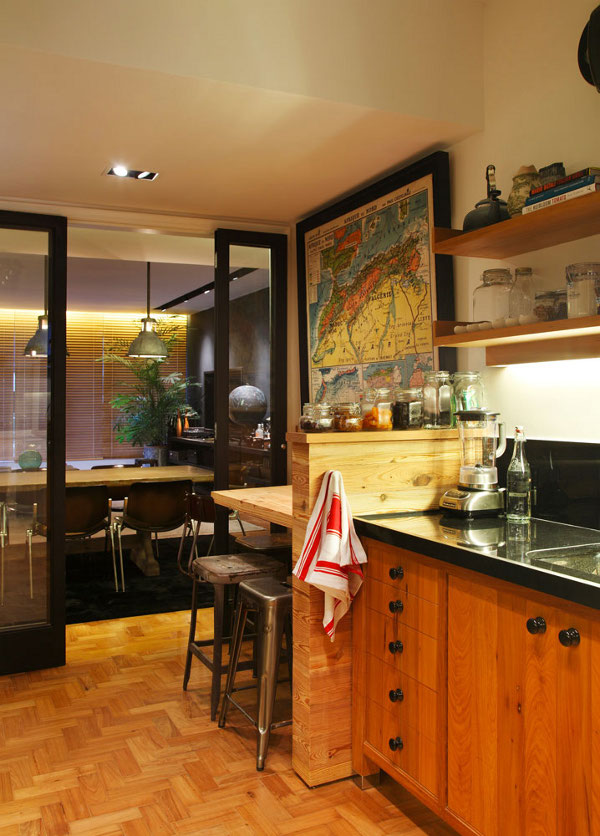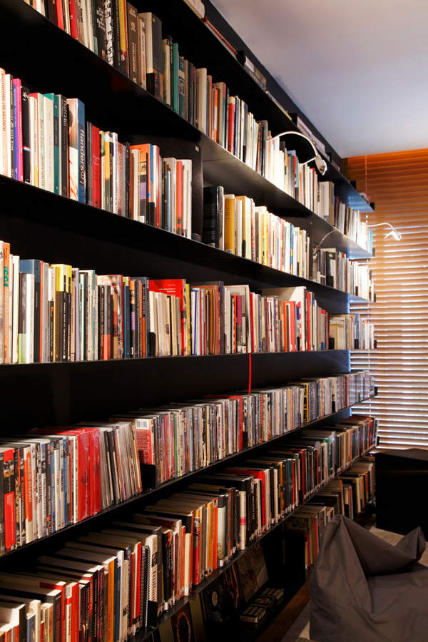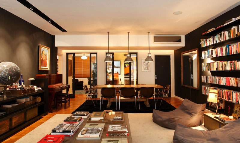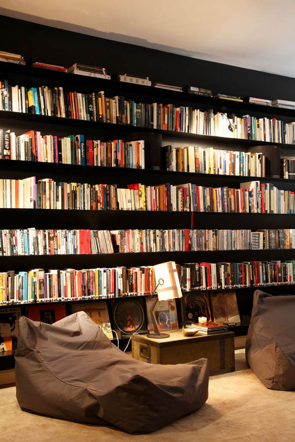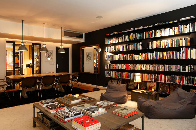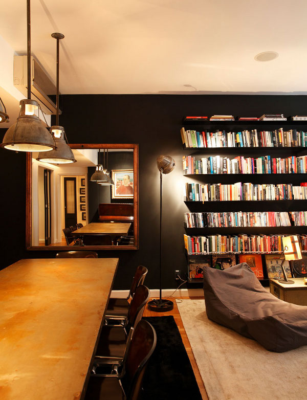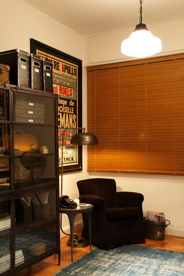This dark and moody apartment is in Rio de Janeiro may well be the nest of that spiny creature deep within the earth but no, instead it is the creation of Brazilian architectural firm Ouriço (Portuguese for hedgehog). Outside it may be bright and sunny and tropical but inside it is calm and cocooning with graphic punches and vintage finds. Love the hero wall of books, the industrial lights and the warmth of the wood. Like a den, a club, a nest.