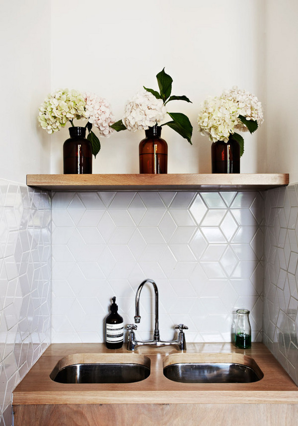 Can you please tell me the maker of the diamond-shaped white tiles in the second to last photo? They look like they're above a small bar sink?