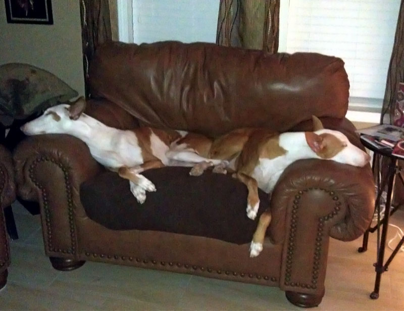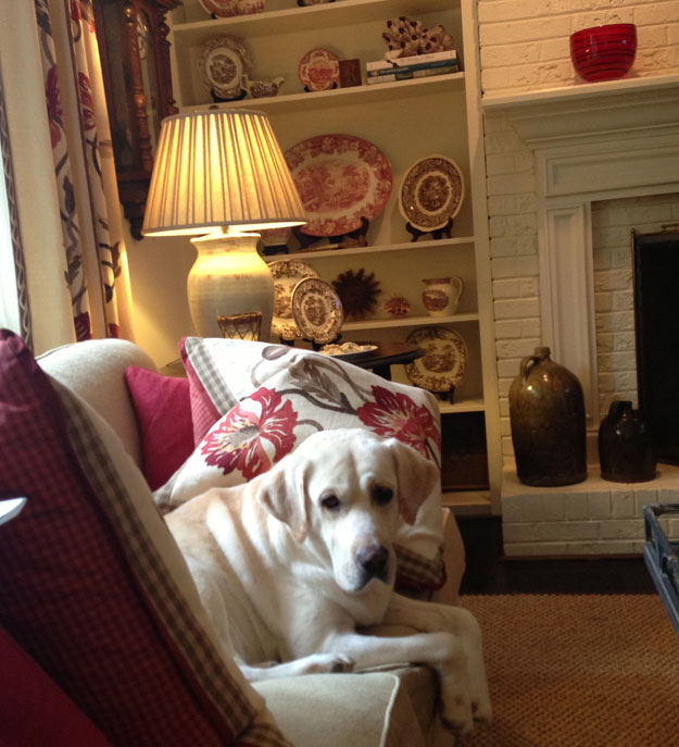 Our white lab, Hunter, loves to snuggle in the pillows on the love seat in our family room. (His nickname is “Rooster”.)
