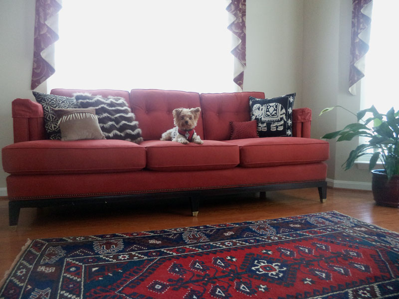 My Yorkie Poo Zulu relaxing on my awesome red couch that I scored at a ReStore store for a great deal. it fit right into my red decor and Zulu loves it!