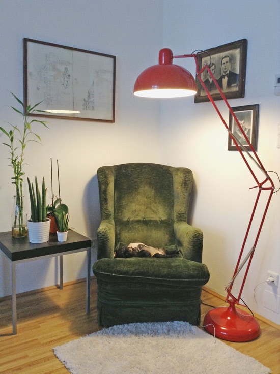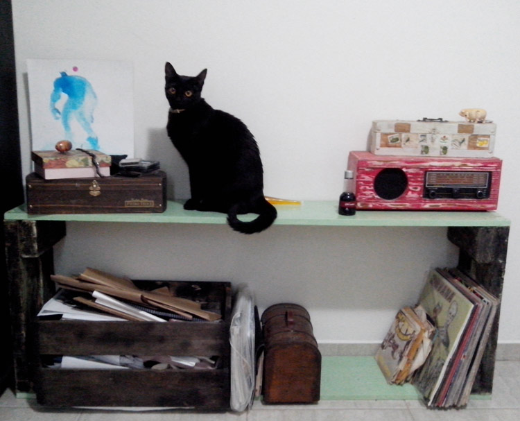This is our black rescued cat Mafalda! She’s sitting over our handmade mini-shelf, I like it ’cause you can only see her deep yellow eyes…
