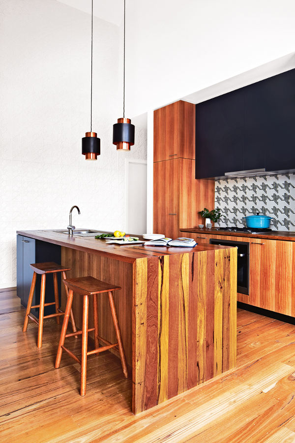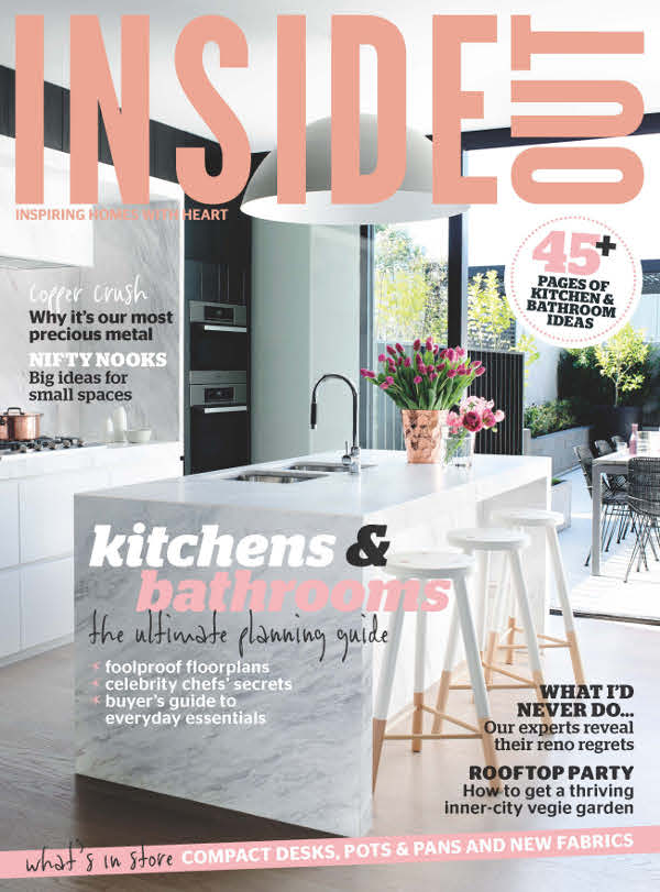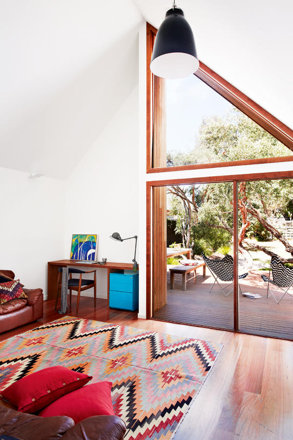 The October issue of Inside Out hits the newsstands on Thursday and once again we have a little something something to whet your appetite. An amuse-bouche. A sneak peek. Managing editor Lee Tran Lam writes “… another great story from the gold-star team of stylist Julia Green and photographer Armelle Habib. This time, they’ve focused on a unique home that has been transformed from its former life as a worker’s cottage (it was actually transported from the Snowy River area to Barwon Heads in Victoria, back in the 1950s). It’s a small space, but the architects – Kate Fitzpatrick and Ben Stibbard of Auhus have done lots of clever things to the site. The houndstooth splashback in the kitchen is an especially lovely detail.” Yes please! Love the houndstooth, the retro vibe, the colourful rugs, love it all.
