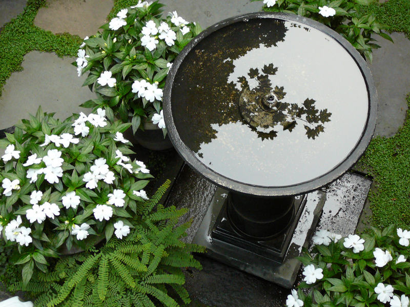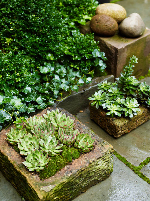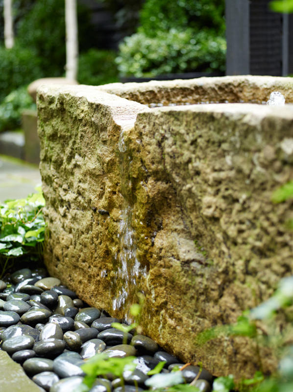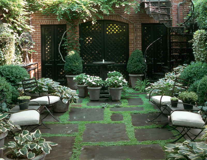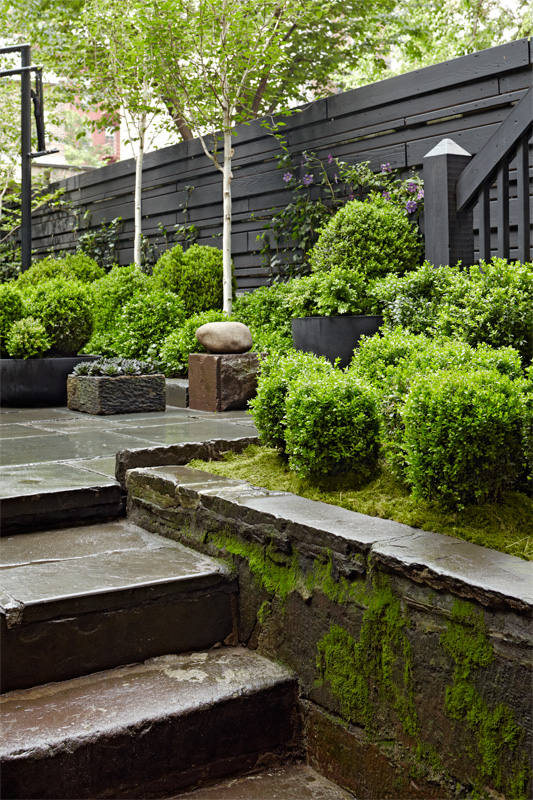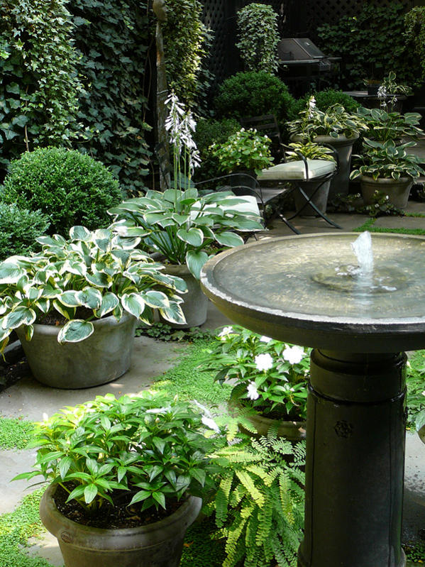After a long dry winter, faced with the prospect of failed summer rains and a dying garden, I sit and stare at my computer screen green with envy. Two small courtyards by Sawyer Berson. Both in New York. Both lush, moist, marvellous. I can feel a faint mist in the air, a soft breeze ruffles the leaves in the trees while cool water naps carved stone. (You may recognise the second courtyard as Julianne Moore’s.)