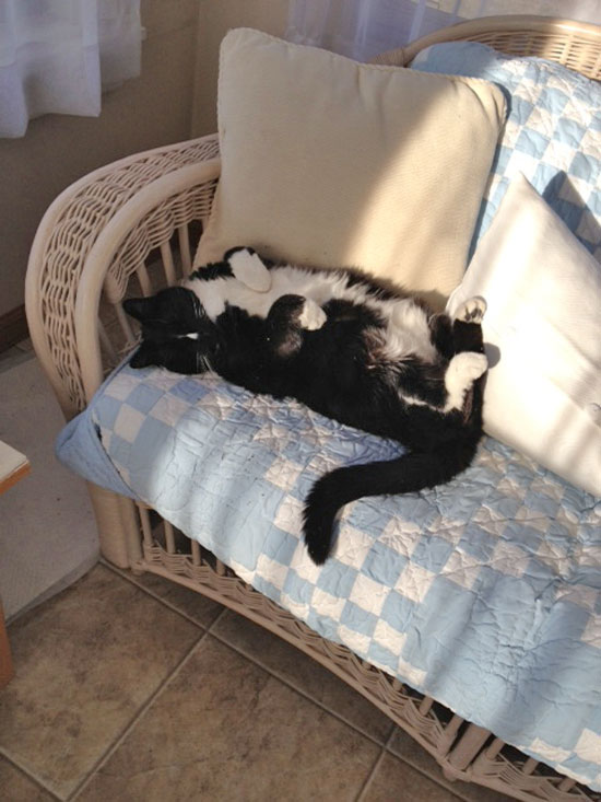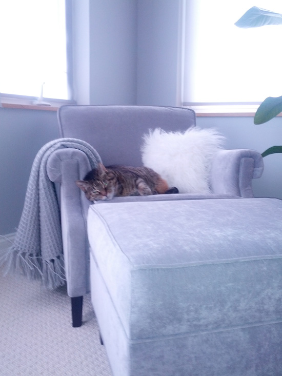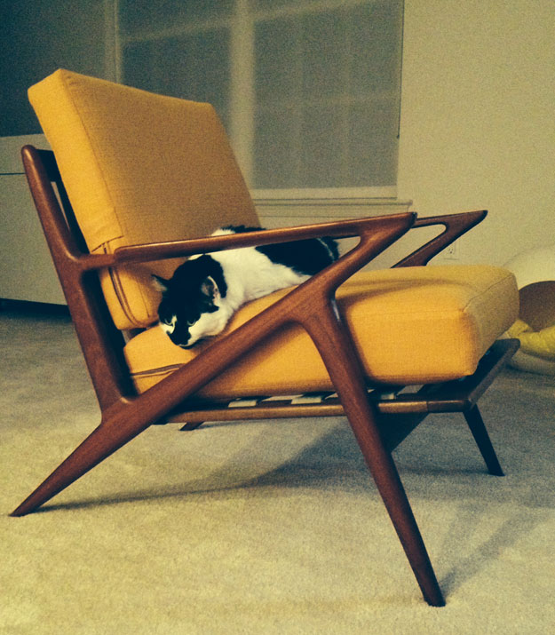 This is Moo Moo on our Vintage Z chair that was refinished by my husband. We’re so glad our cats continue to enjoy our furniture before we can get to it! Cats do always seem to find the best spots in the house.