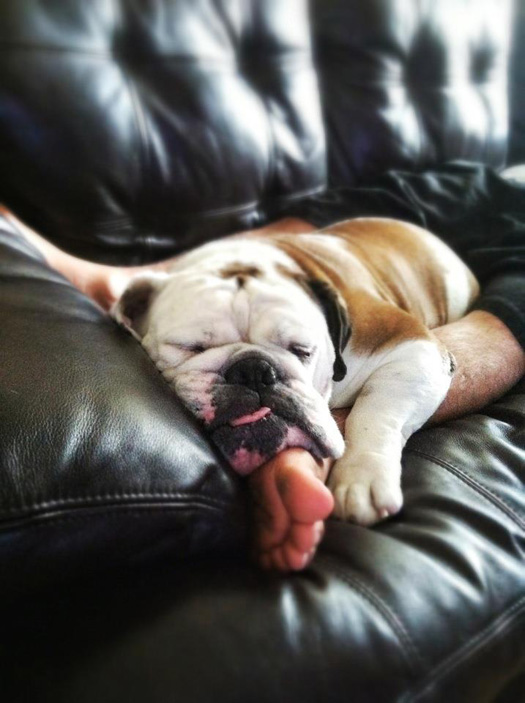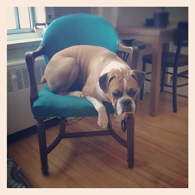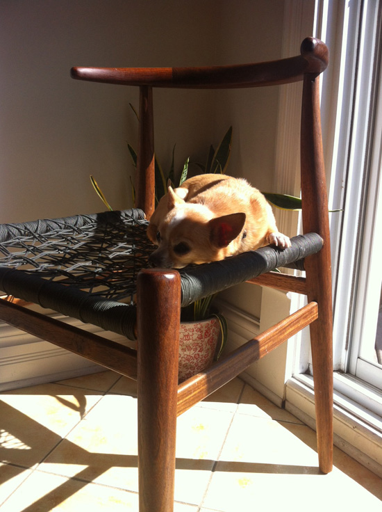 I’d like to submit this photo of Weenie in her favorite spot, my grandfather’s newly reupholstered club chair with matching ottoman.