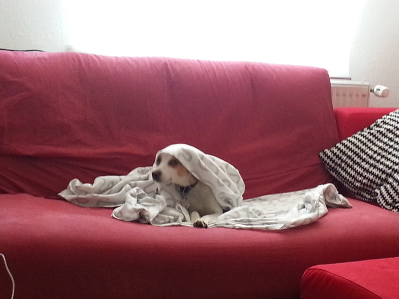 This is our rescue puppy Argo, snoozing on his favourite design Wink armchair by the fire at my in-laws. He also likes cheaper furniture, like the Ikea sofa in the second picture.