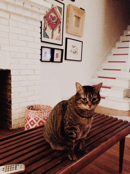 This is one of my girl Lola sitting on my vintage bench/coffee table. She’s usually in my lap along with her sisters.