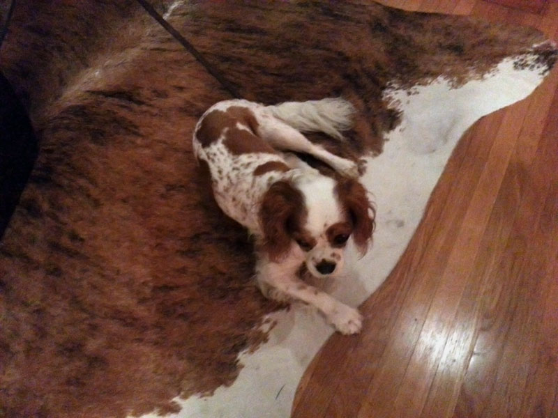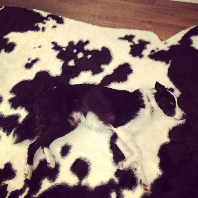 This is our two year old border collie, Jersey. He recently discovered that a cowhide rug provides the perfect camouflage. We are constantly in danger of stepping on him!