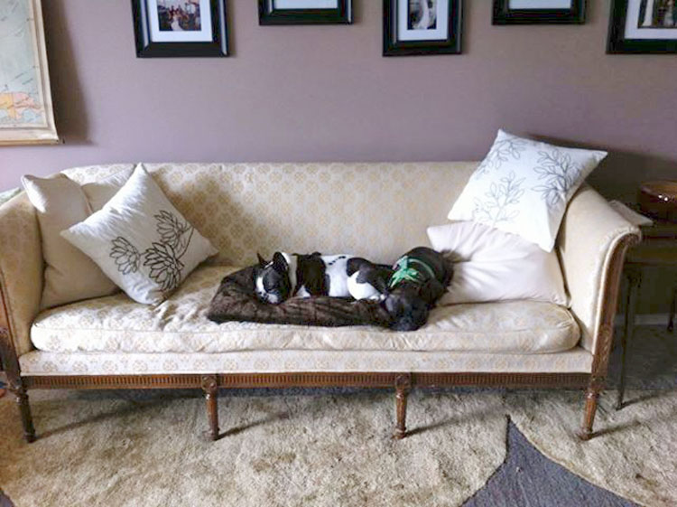 The attached photo is of my two French Bulldogs, Olive and Truffle, on the newly acquired vintage couch. They have 3 dog beds in the living room, but insist on the couch 🙂