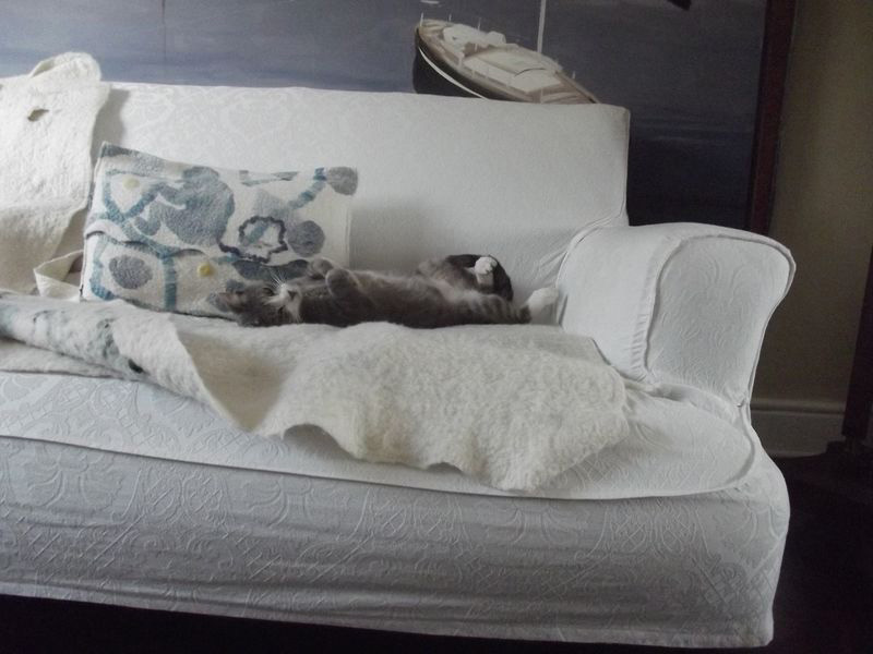 Hey Deon, I recognize your sofa! It's because your previous photo of Monkey hiding behind the cushion was the funniest Pets on Furniture ever and is now my screensaver. Someday we need to see all your cats on the sofa at once.