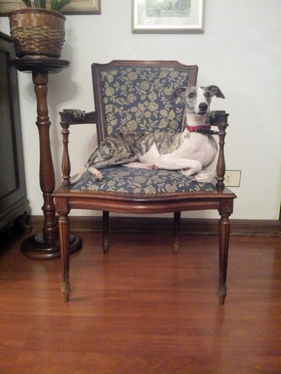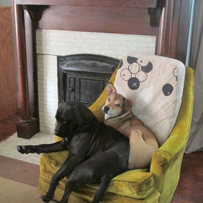 This was the first piece of furniture I acquired. Buddy (the brown dog) immediately claimed it as his. My second dog, who is not featured in this picture, decided we needed to redecorate and kindly removed the fabric from the upper cushion while we were out one day. So, I did some rudimentary recovering. Now our new foster dog, Simon, has decided that he fits too 🙂 Its still my favorite chair in the house!