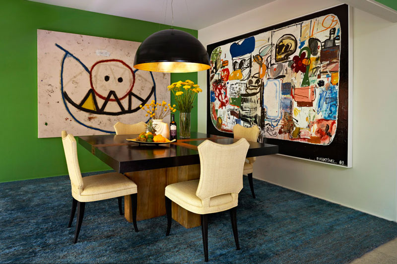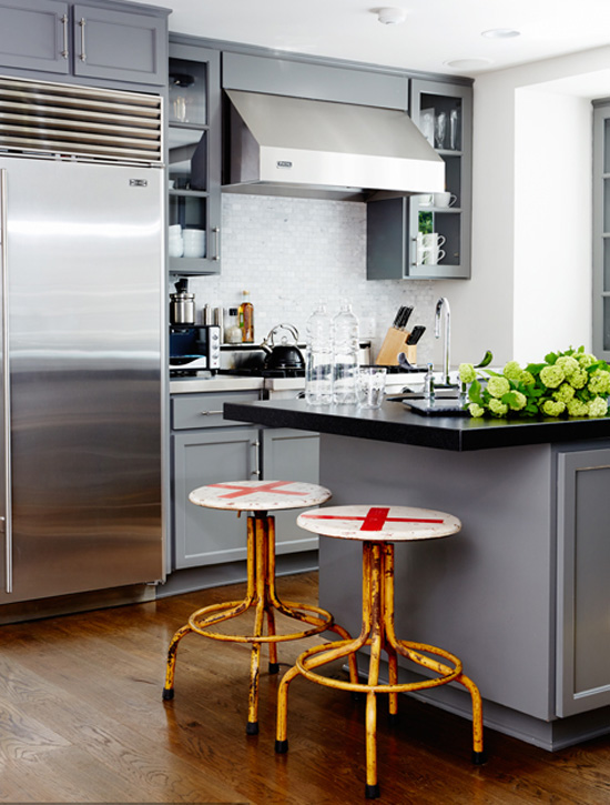 It has been several years since we featured Beverly Hills interior designer Kishani Perera (here and here). She continues to leave me captivated with her elegant yet eclectic, classy yet comfortable interiors that seem to get better and better over time. Throw in some vintage industrial bar stools into a chic grey kitchen. Paint a door or dining room walls black for drama. Kelly green walls and kitchen cabinets for the daring. Love it all.