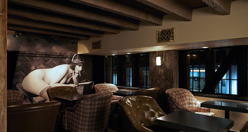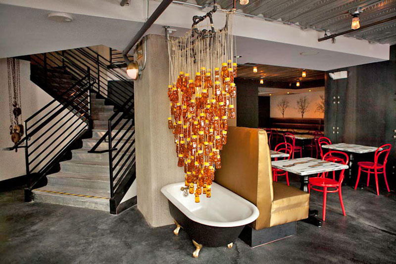 While the honeybear chandie/bathtub installation is… interesting, as is the box-end wall covering… oh lord. This is the most horrifying collection of furniture I've ever seen in my life. From mustard-colored velvet to the Lucite box with rope handles, this is frightening. Not to mention, the grand piano shoved wrong-way round into the corner? Anyone who knows how sound works is crying. These designs might work for very rich, extremely *elderly* clients, but I can't see anyone with a flicker of life left queuing up to pre-pay for a holiday week in Hill House.
