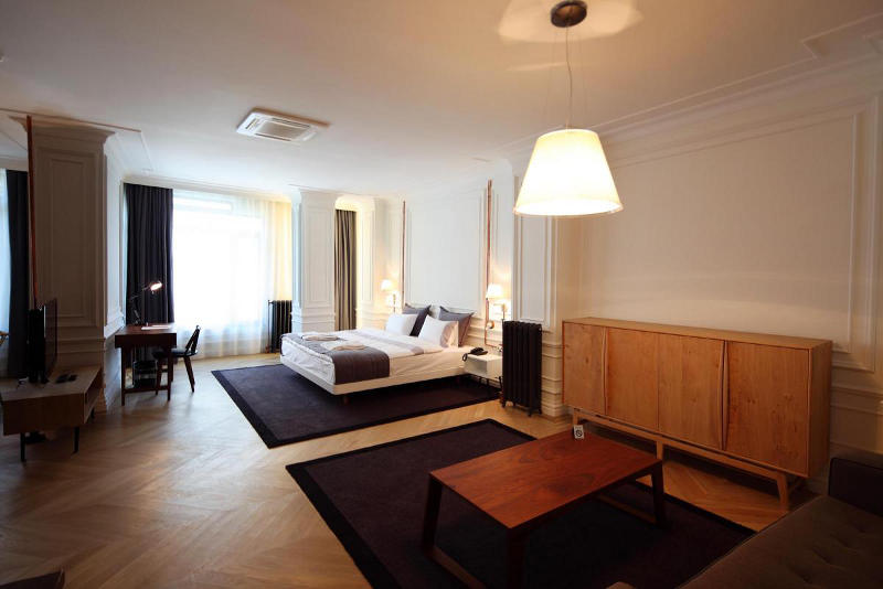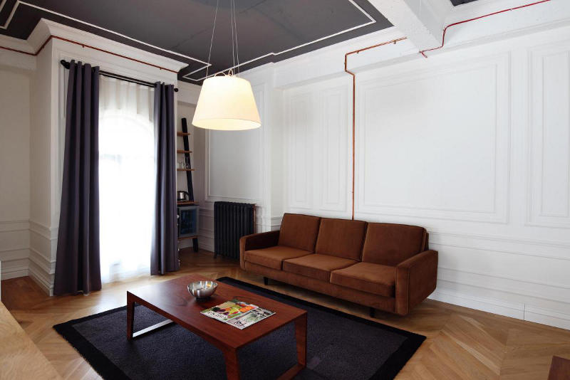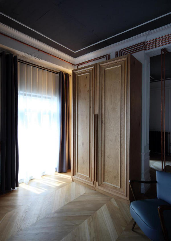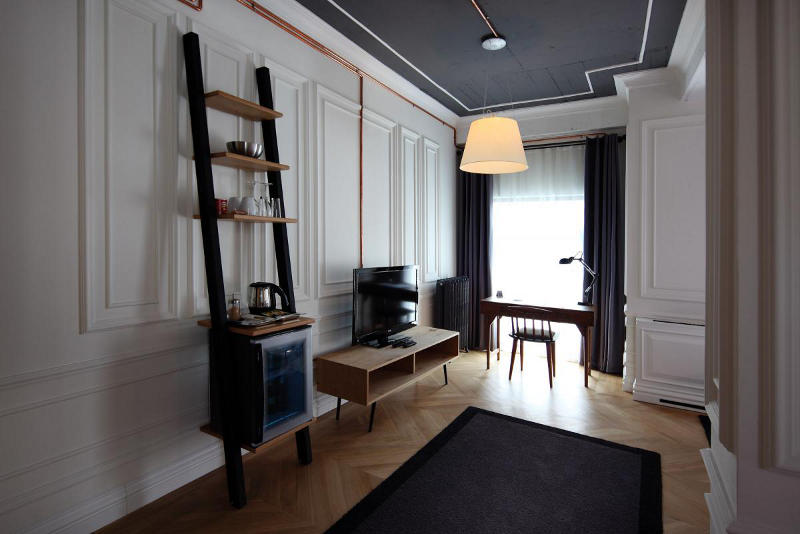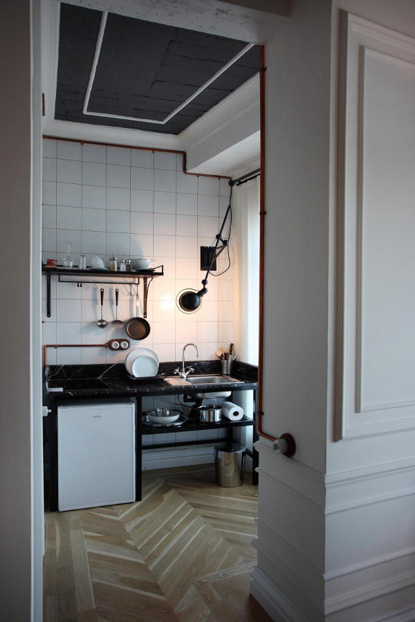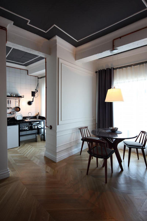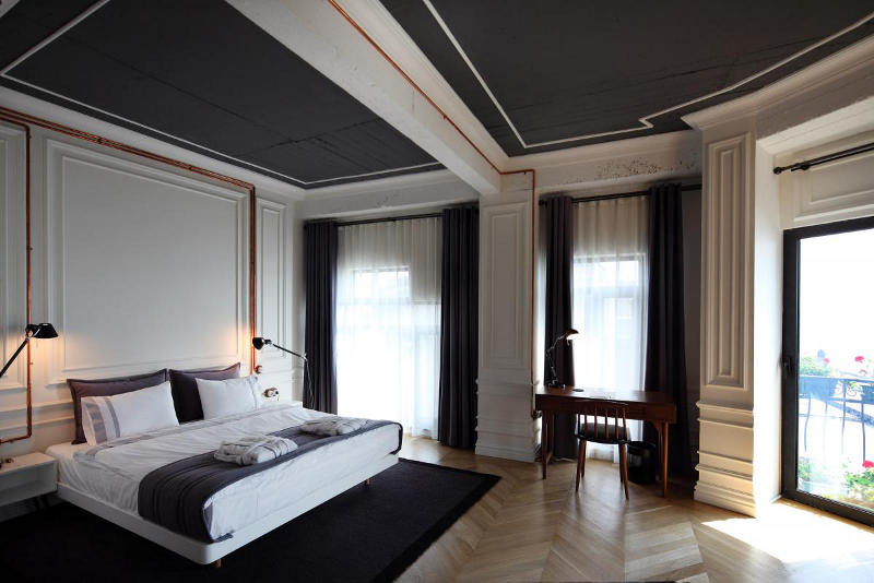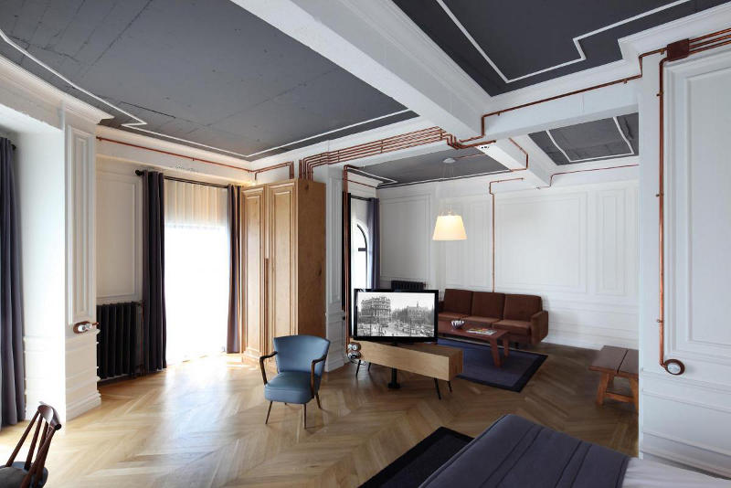 Situated in a 100 year old building in Istanbul is the boutique hotel, Karaköy Rooms. The elegant renovation by Turkish design firm RunArchitecture is a modern take on a once grand past. White walls, often with dark grey ceilings, are balanced by wooden floors. Where original mouldings are missing they are simply replaced or referenced with paint. Perhaps the standout feature of each room is the exposed copper piping that carries the electrical supply. Simply modern and historically fabulous.