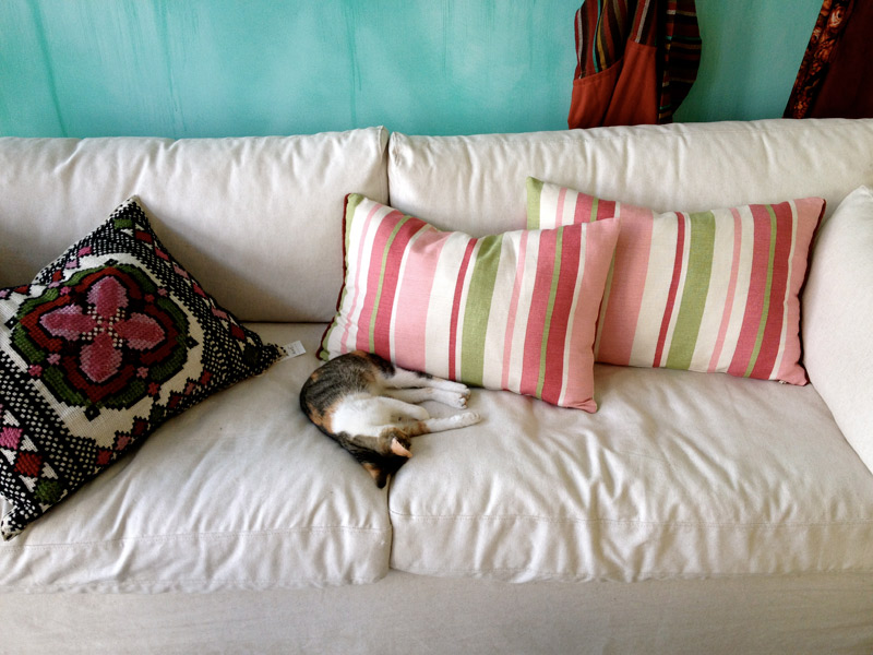 This friendly stray cat wanted to be adopted. Every day, she quietly entered our shop and settled on the main window display furniture, hoping to pass unnoticed. For this reason rarely did she move, up until the closing time when we had to take her out, to her disappointment, but with a small treat. She did eventually win our hearts:-) and the heart of a passing neighbour, who saw her through the window and decided to offer her a home.