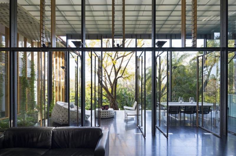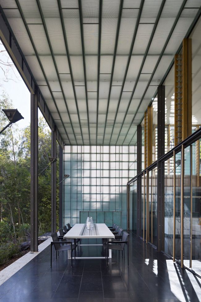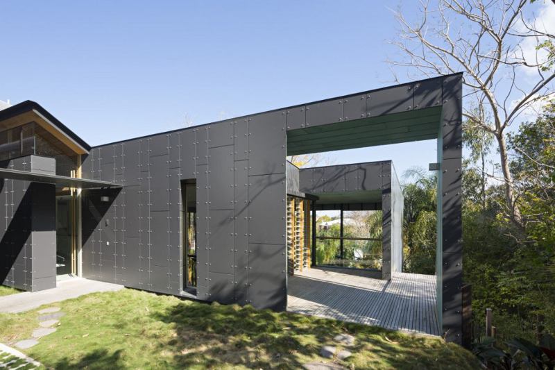 A contemporary extension to an historic house carves its way down the slope of an inner Brisbane ridge line. This architect’s home plays old against new, street facade against the views through the backyard, intimate against expansive. The original timber cottage remains as guest house and entry while the addition is about family living and the landscape. The Taringa House by Loucas Zahos Architects.