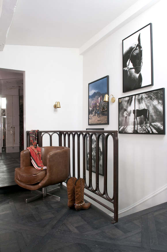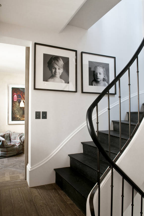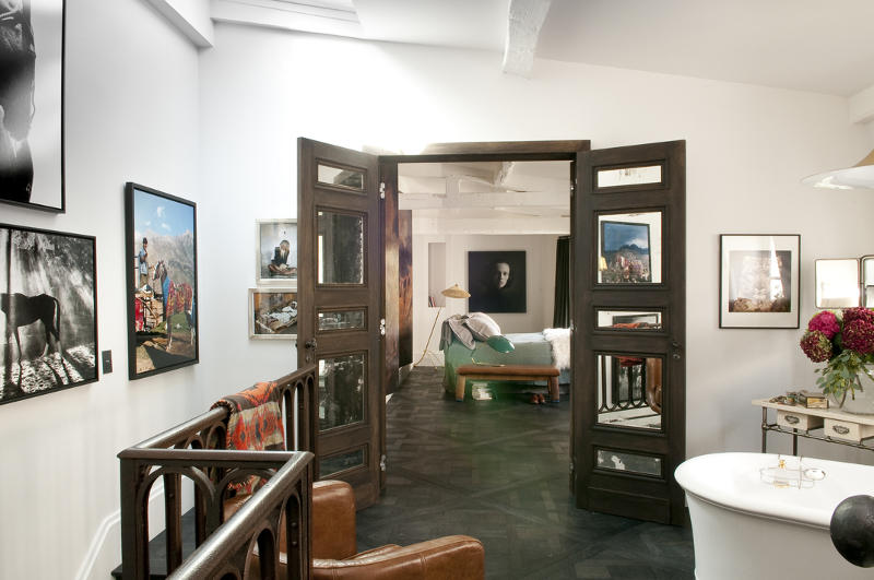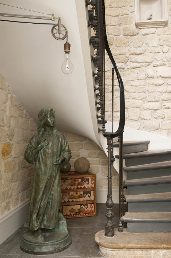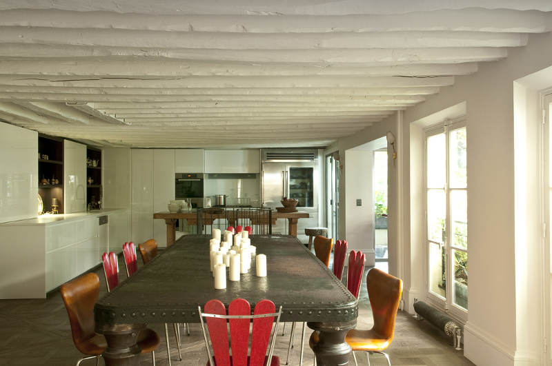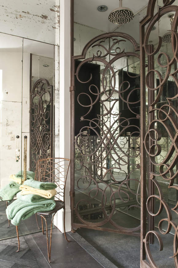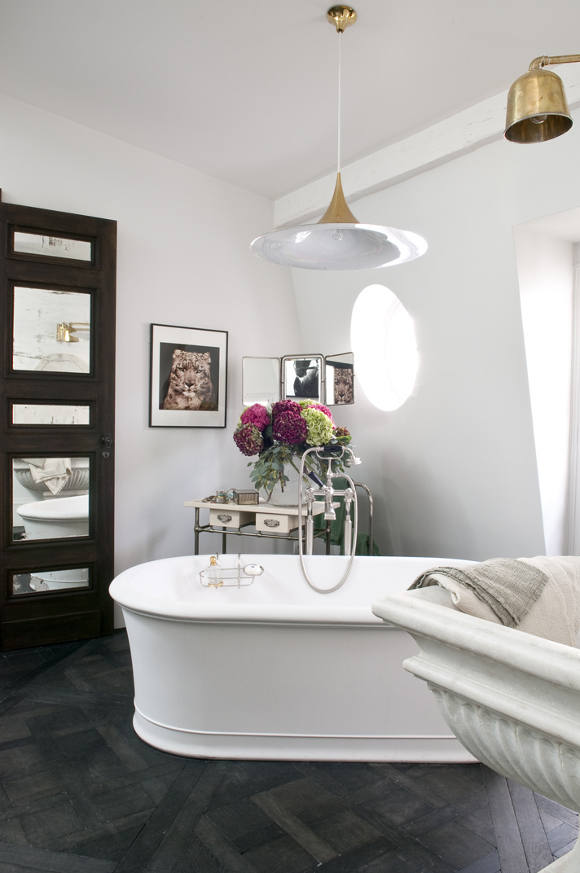 Oh my! Oh my! A confection of stylish French living. A family home, yes, but “effortlessly” elegant. Amazing architecture helps, as do vintage and brocante cheek to cheek with high end designer pieces, but those floors and the exposed beams! The art! The courtyard and window boxes!The boudoir with a bathing suite and scrolly shower! The children’s bunk room! Exclamation mark overdose. I think I died and woke up in heaven on a Campana Brothers Boa sofa. Parisian perfection by Elodie Sire of D.mesure.