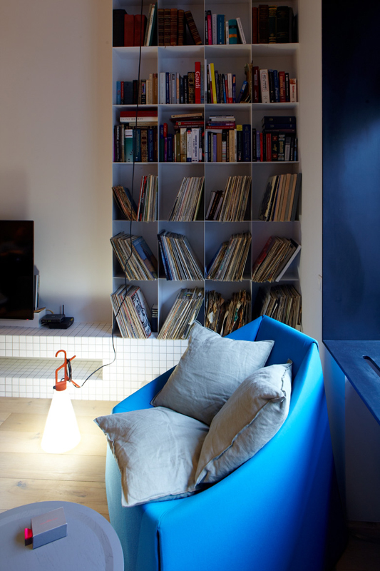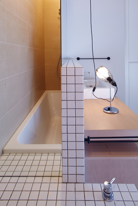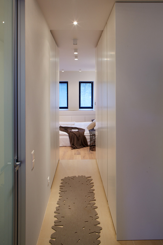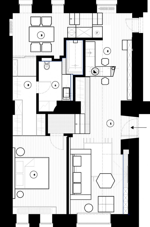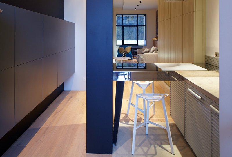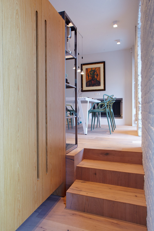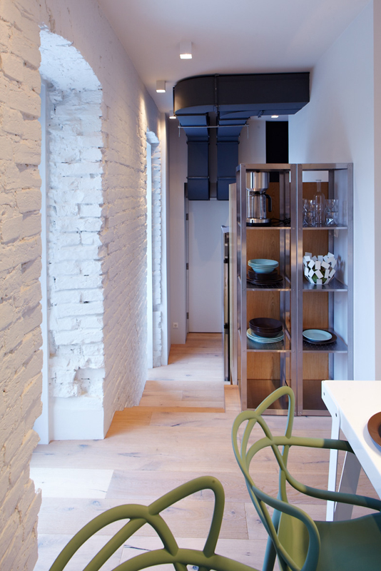 A 21st century apartment in a 19th century house in Kiev, Ukraine. A sleek contemporary space pieced together carefully within a rough brick shell. Subtle changes in floor heights lead you from living room and kitchen to the dining room or up a few a few stairs to the bedroom and bath. A cool urban pad by Olga Akulov DESIGN.
