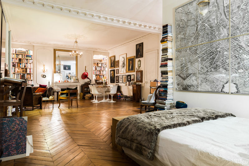 I have never been to Paris, but if I were to go, I want to stay here. This is exactly how I picture living in Paris to be like. A studio apartment with original herringbone hardwood floors, fireplaces, massive gilt mirrors, ancient looking leather club chairs, classic antique light fixtures and portraits, stacks of old books and suitcases…it’s perfect. I’d spend all of my time here or in a café drinking copious amounts of coffee and wine. Via The Village.