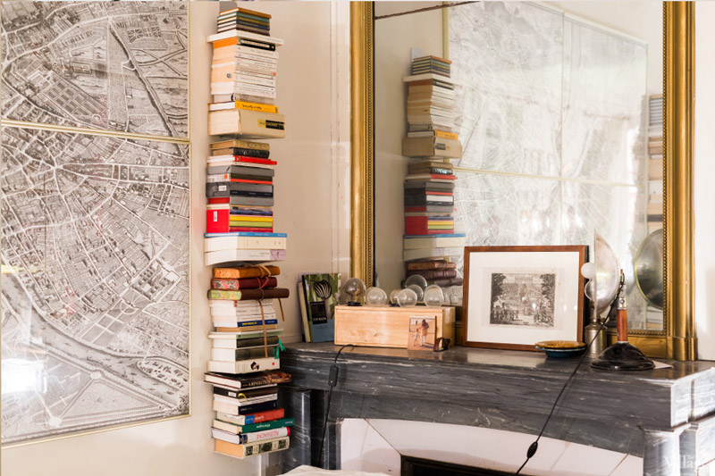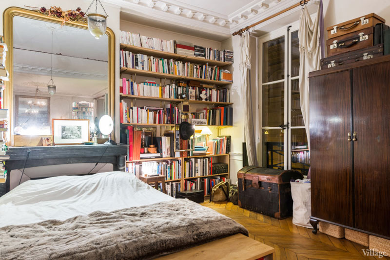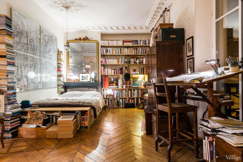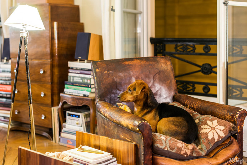 You know it's funny because this is actually our place. My cousin sent me the link! The dog was a loaner — her name is Georgie. She is of no particular breed, except perhaps good old Parisian mutt. I felt weird because I didn't know the magazine that sent the photographer so I felt it best to have an animal around — not that the beautiful Georgie could do much! As for the lighting, the photographer did what he could but our place is extremely dark so he needed to do extremely long exposures. And as for the clutter, I can only say that it had only gotten worse since. We're both inveterate collectors! But I was flattered by the commentaries.