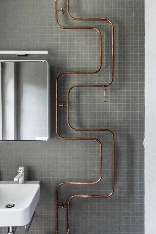 I love anything copper, so this bathroom with exposed copper piping is going into my inspiration folder. LOVE IT!!! Via Karhard Architektur.
