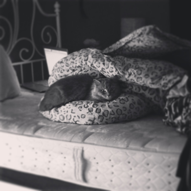 Before I get started on today’s pets on furniture, I wanted to share this photo of my stray cat Agnes I rescued last week. This was taken about 15 minutes after I brought her to her new home. She wandered around the apartment sniffing every nook and cranny, then hopped on the bed and decided to have a nap. I am so happy she didn’t have to spend any more time cooped up in my bathroom and her new owner Jasmine is going to take really good care of, including getting all the surgeries done on her she needs ASAP, which will likely cost around $1200. I have donated all I can and I have received a few donations from some very kind folks (thank you all!!!) but it barely covers the surgeries so if you are able to make a donation I would be SOOOO grateful – Jasmine (who works for a non-profit org) was so kind to take this cat in I feel terrible that Agnes comes with such a hefty bill. You can send me a bank transfer if you’re in Canada, or Paypal me at kim_j92[at]hotmail[dot]com. Thank you 🙂