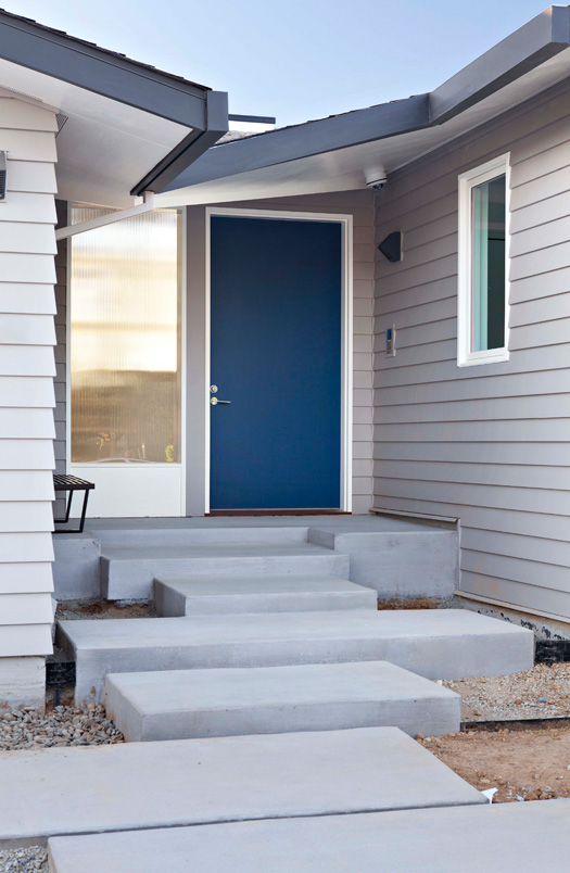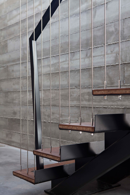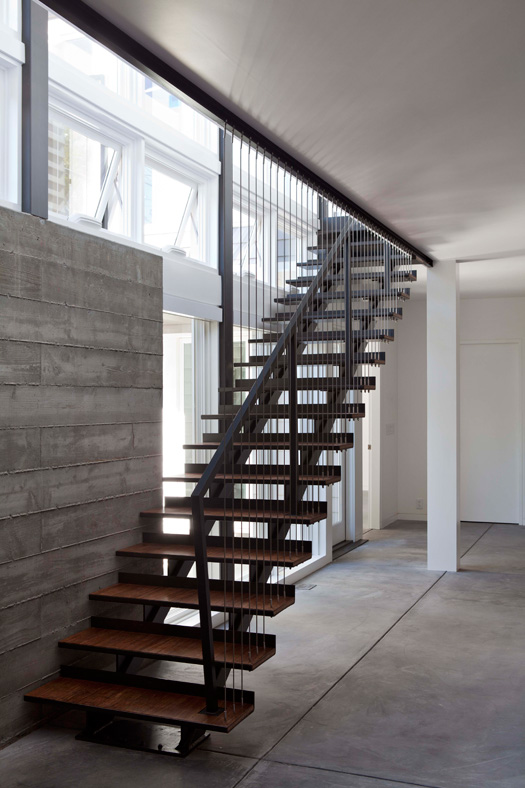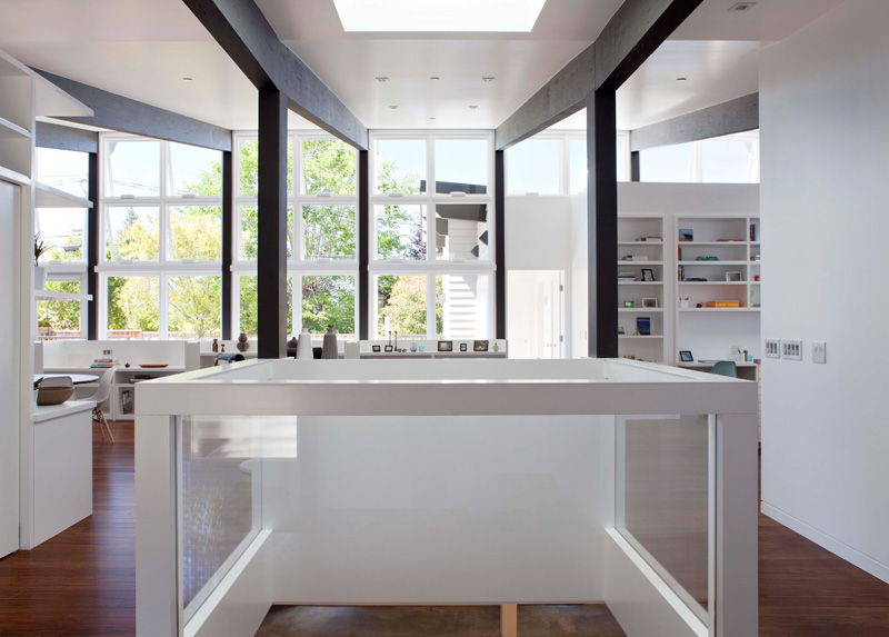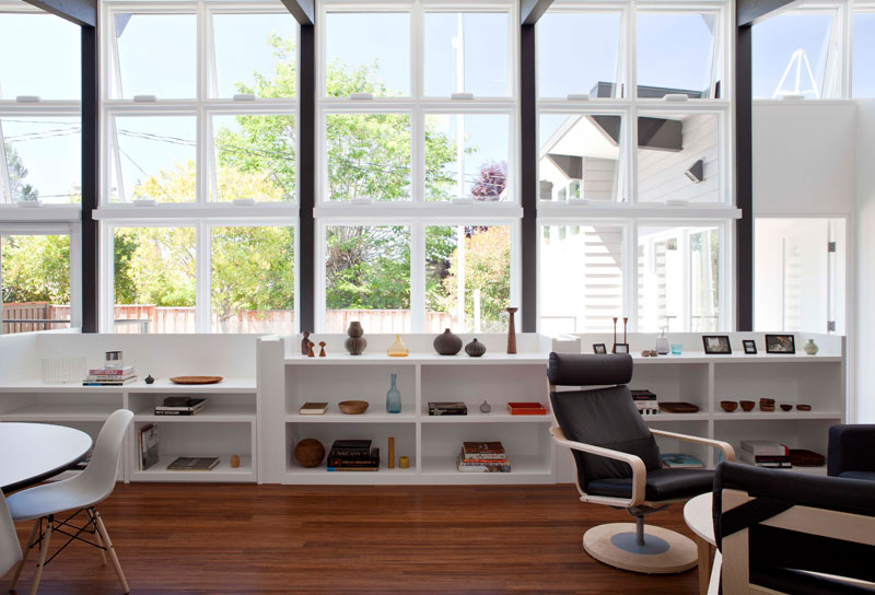 The folks at Klopf Architecture sent over some of their projects and this one immediately caught my eye. This is a dream home for a collector or avid bookworm – the amount of shelving is amazing! (I’d have to hire someone to come and do the dusting though). Here’s a bit of info on this fantastic, net-zero energy home: The owners de-constructed their existing house when they realized that any single-story design meeting their needs would completely eliminate their back yard. They directed Klopf Architecture to design a net-zero energy, two-level home to be a contemporary interpretation of Eichler in style yet keep their single story neighborhood happy. The site, a cul-de-sac lot which was the not large enough for a single-story home that would fit the needs of these owners who both work from home. They wanted this to be their “final” residence so Klopf needed to design a larger-than-normal home to suit their lifestyle needs. Instead of adding a second story (and annoying the neighbors) they opted for a partially-submerged lower level that Klopf designed furthest from a basement as possible (with a pulled-back floor plate, a light-filled “atrium” and a lower level light well).