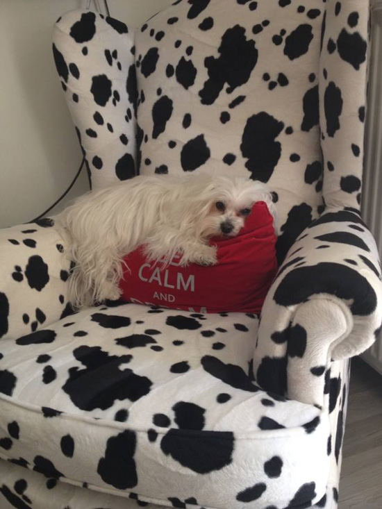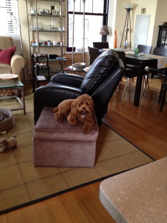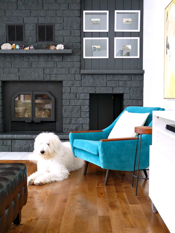 Slight problem. My 75 pound Komondor puppy (yes, puppy), Szuka, couldn’t fit on the furniture even if she was allowed. To my chagrin, though, she is totally smitten with the one piece of furniture I’d prefer she not rub her perpetually damp beard all over. I found the mid-century chair in this photo curbside, on my way to the Ottawa Bluesfest last summer, and had it reupholstered in a stunning teal velvet right before I moved away from the Ottawa area. It’s become a deeply sentimental piece to me. She must sense how much I love it, because she spends most of her day leaning against, rubbing herself along, or just chilling beside this precious chair. So apparently we share a love for it. I know Pets on Furniture is about pets on furniture, and not “pets adorably situated in the vicinity of furniture,” but it’s not her fault – if she could fit comfortably, she’d be all over this chair like butter on toast.