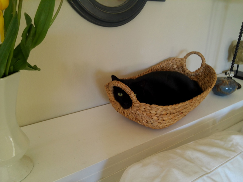 1 – I had just cleared the holiday decorations from the sofa table and placed that basket there for a second when Kiki claimed it. It’s her most favorite spot ever, and now a permanent part of the tableau!