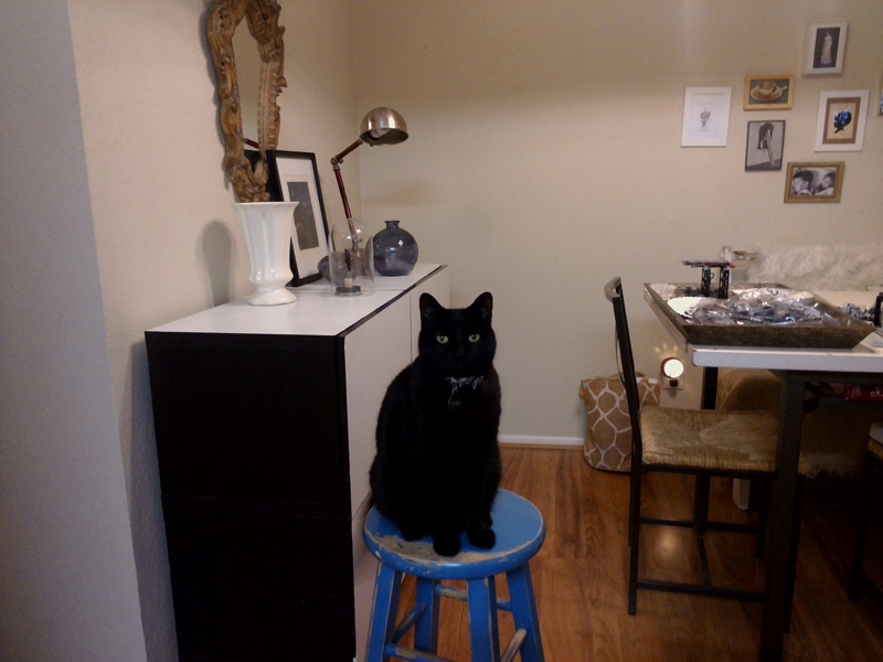 2 – This was another “I’ll set this down for a second…” incident of which Kiki is so fond. The stool was en route to my daughter’s room, but in the half-minute it took me to drink some water, Kiki commandeered it and presently lords over us from her dining room perch.
